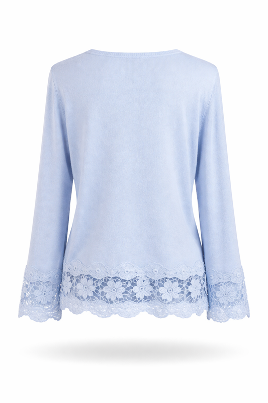 Damen langarm Shirt mit ausgestellten Ärmeln & Spitze hellblau, Größe 36-40