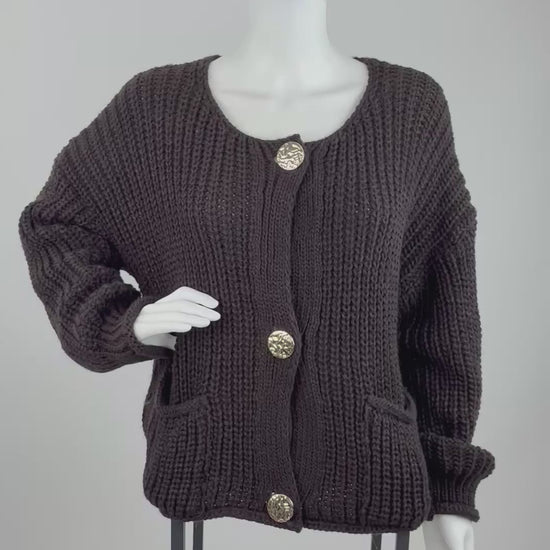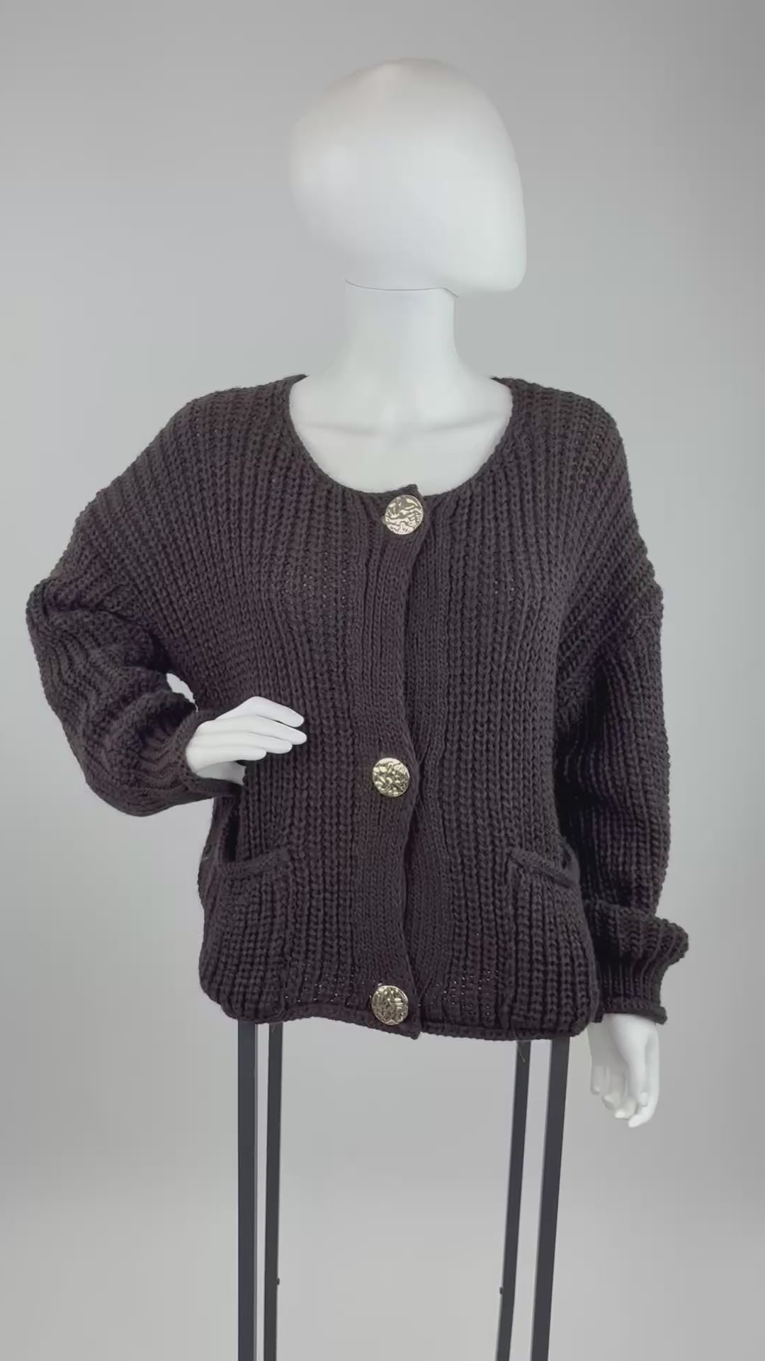 Das grob gestrickte Design sorgt für eine warme, gemütliche Haptik, während die großen, goldfarbenen Knöpfe einen eleganten Akzent setzen. Dank der lockeren Passform lässt sich der Strickcardigan wunderbar über Shirts, Blusen oder leichte Pullover tragen – perfekt für kühle Tage und entspannte Looks.