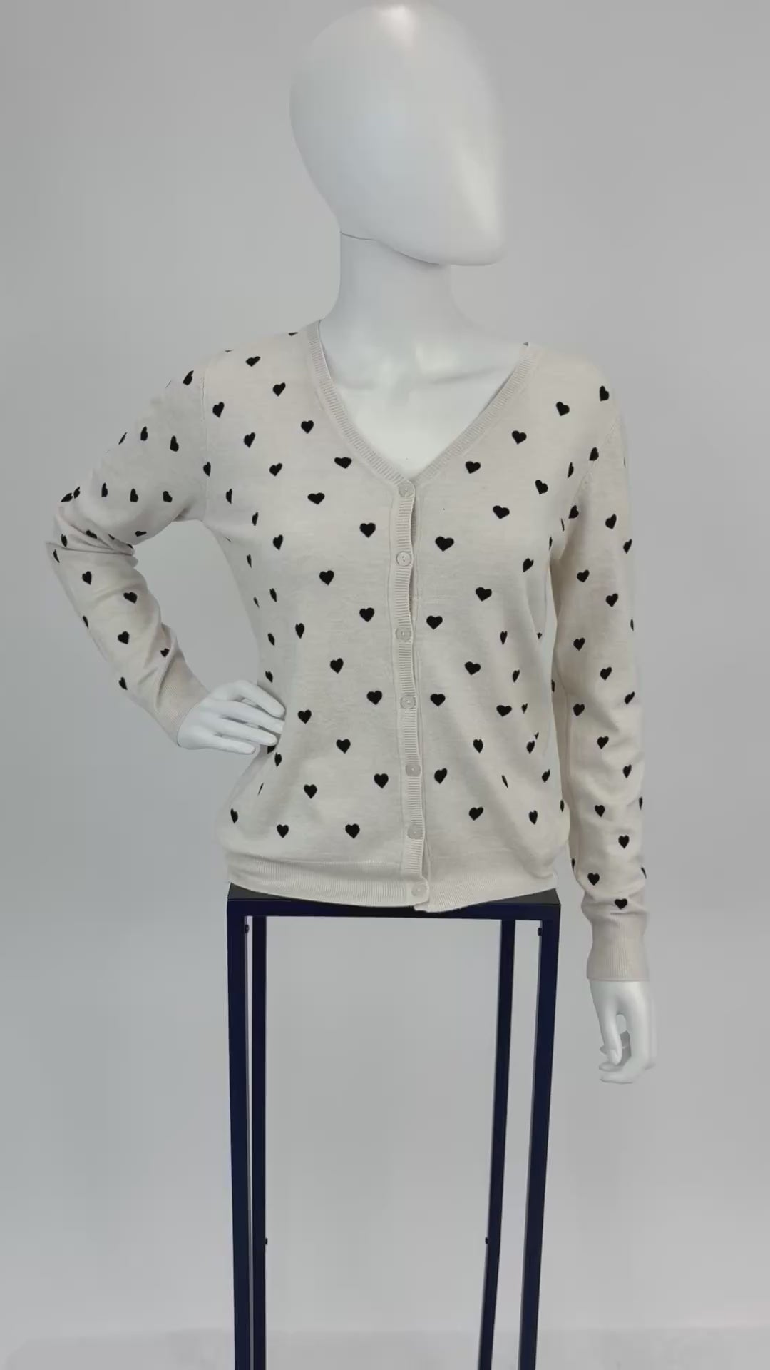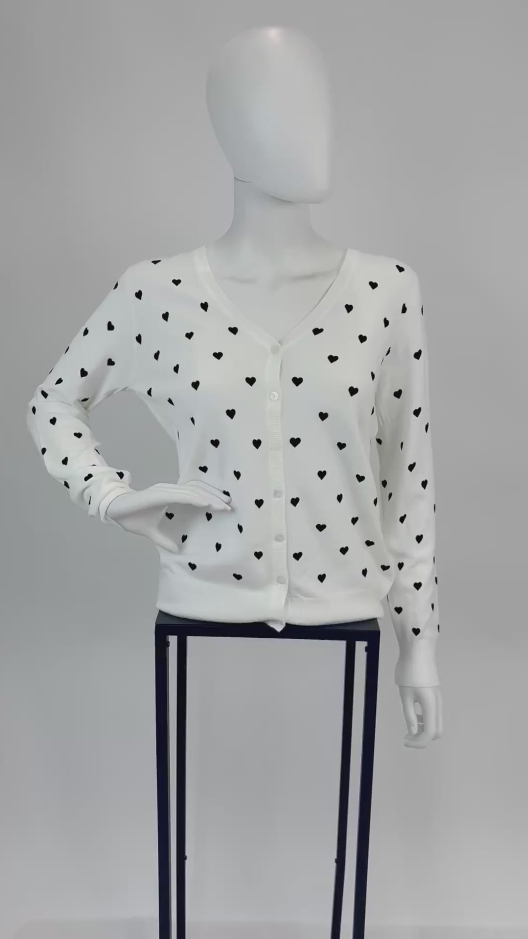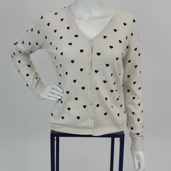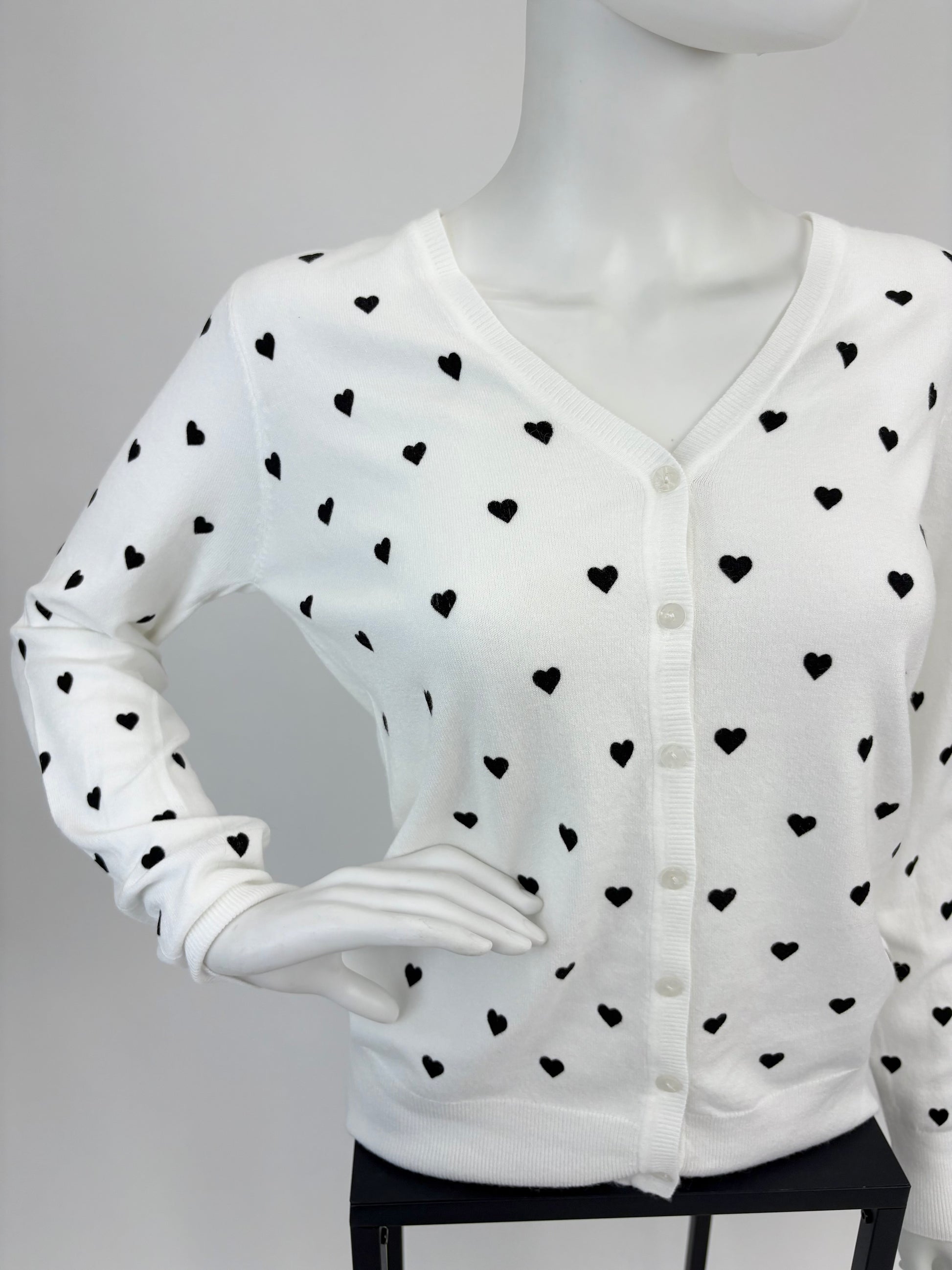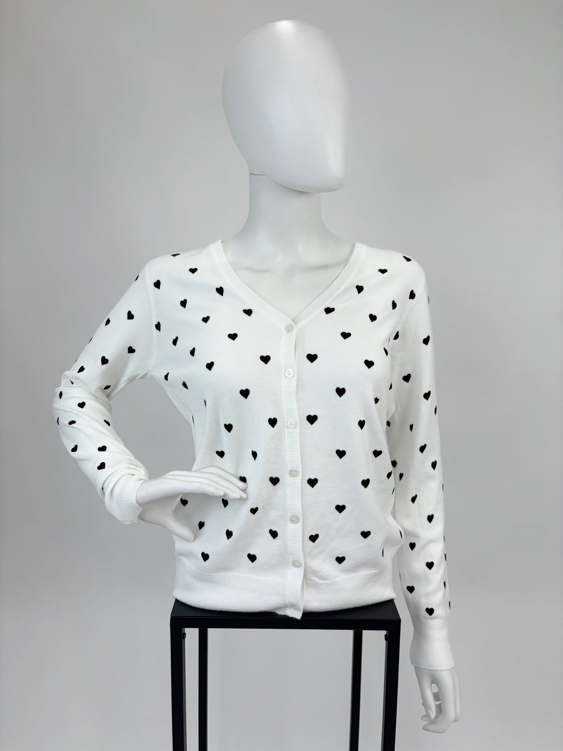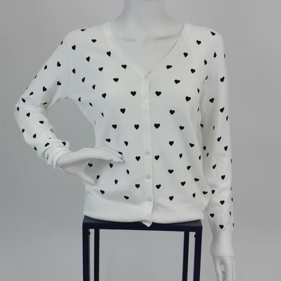 Verleihe deinem Outfit eine romantische Note mit diesem weißen Cardigan im süßen Herzchen-Design. Das weiche Strickmaterial sorgt für hohen Tragekomfort, während die feinen kleinen Herzchen einen charmanten Blickfang bilden. Ein Must-have für alle, die verspielte Details lieben und trotzdem klassisch-elegant bleiben wollen.