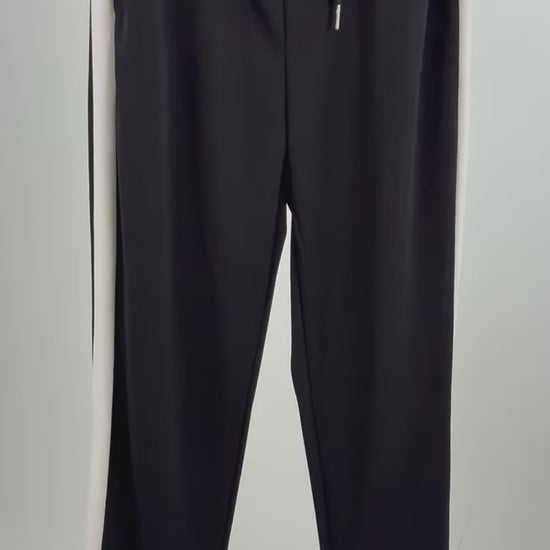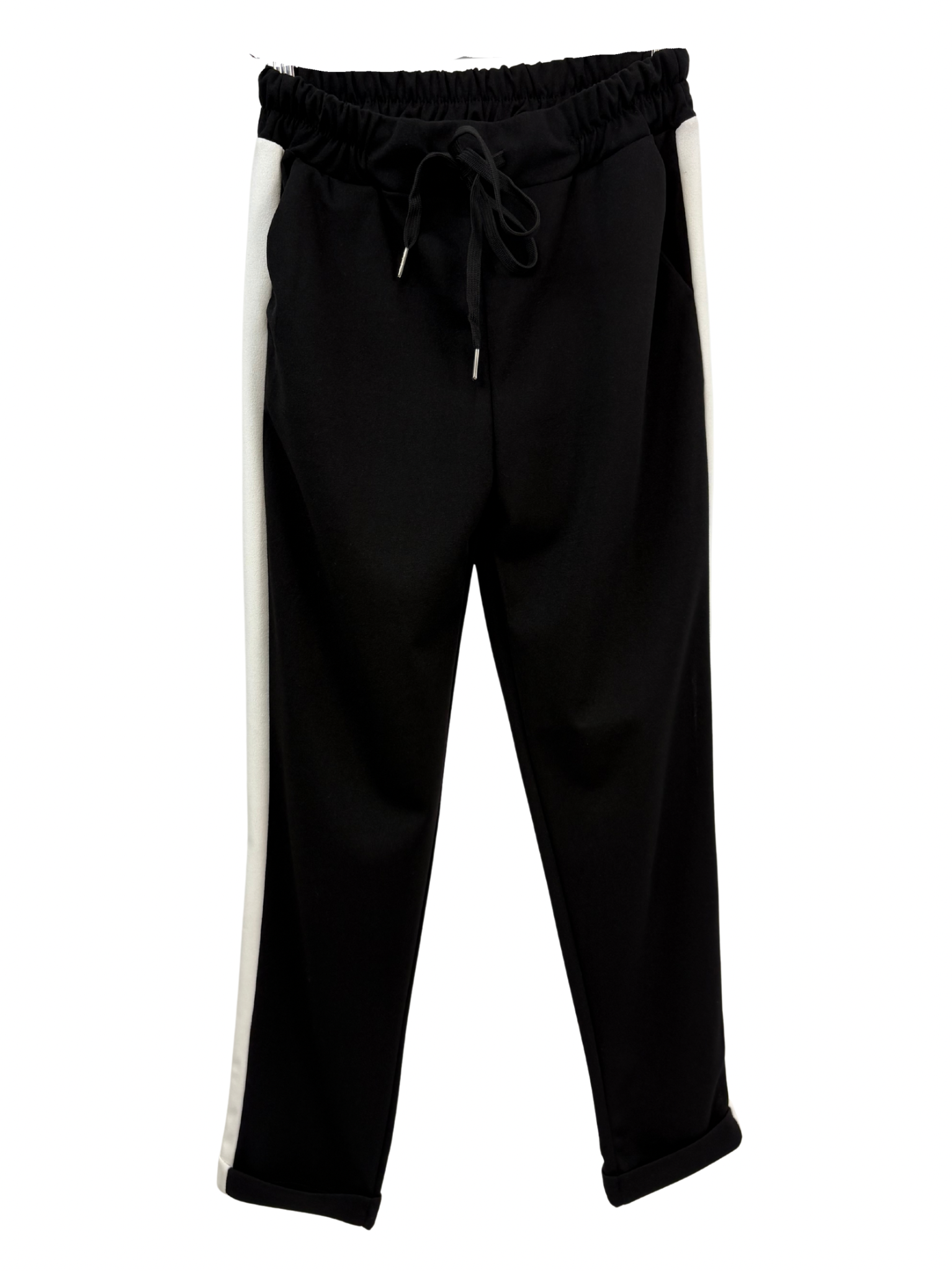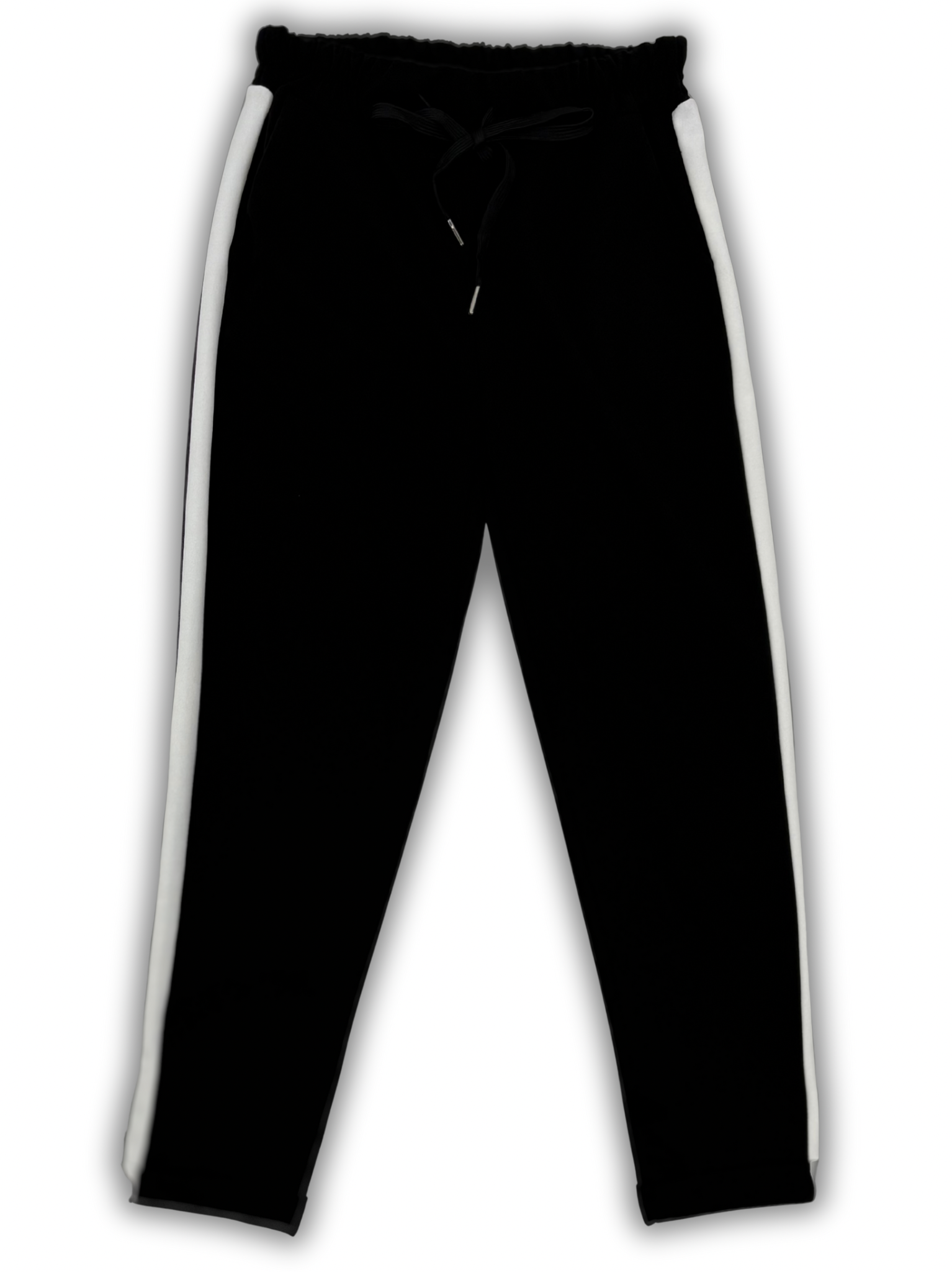 Diese sportlich-elegante Hose kombiniert Bequemlichkeit mit trendigem Design. Der elastische Bund mit Kordelzug sorgt für eine optimale Passform, während die seitlichen Eingrifftaschen praktische Details bieten. Das Highlight ist der weiße seitliche Streifen, der der Hose einen modernen Kontrast und einen sportlichen Akzent verleiht. Mit ihrer schmal zulaufenden Beinform und dem umgeschlagenen Saum ist sie ein vielseitiger Begleiter – ob für Freizeit, Alltag oder ein entspanntes Streetwear-Outfit.