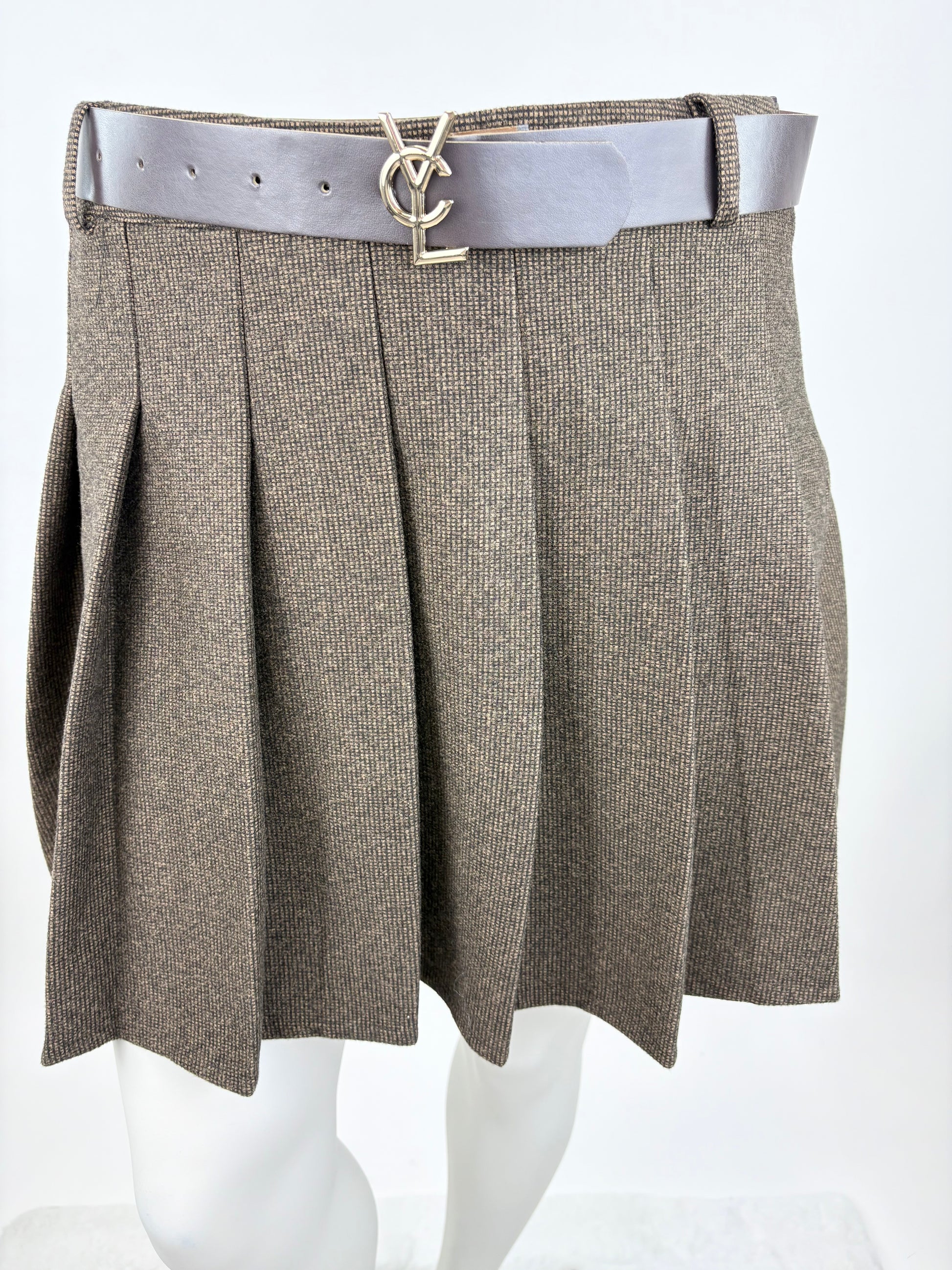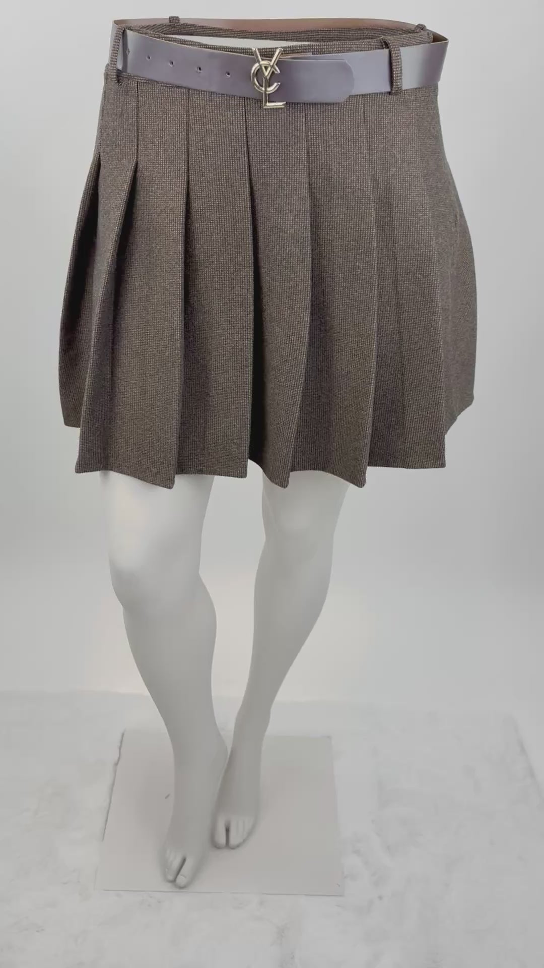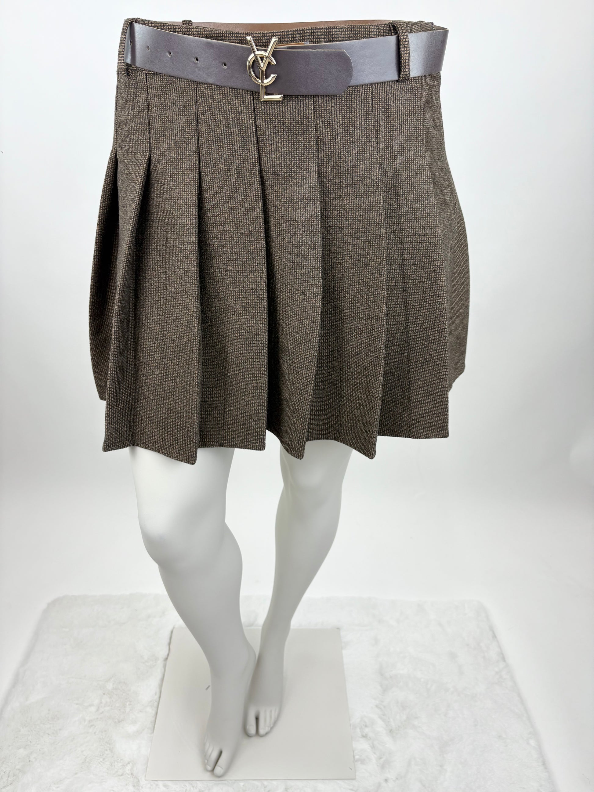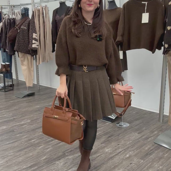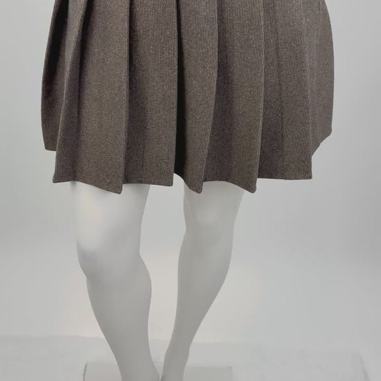 Der Rock besticht durch seine sorgfältig gesetzten Falten, die eine schöne, schwingende Silhouette schaffen und gleichzeitig für einen edlen Look sorgen. Das dezente, fein strukturierte Stoffmuster in Braun verleiht dem Rock eine klassische Note, die sich perfekt zu schlichten Blusen, Rollkragenpullovern oder Strickoberteilen kombinieren lässt.