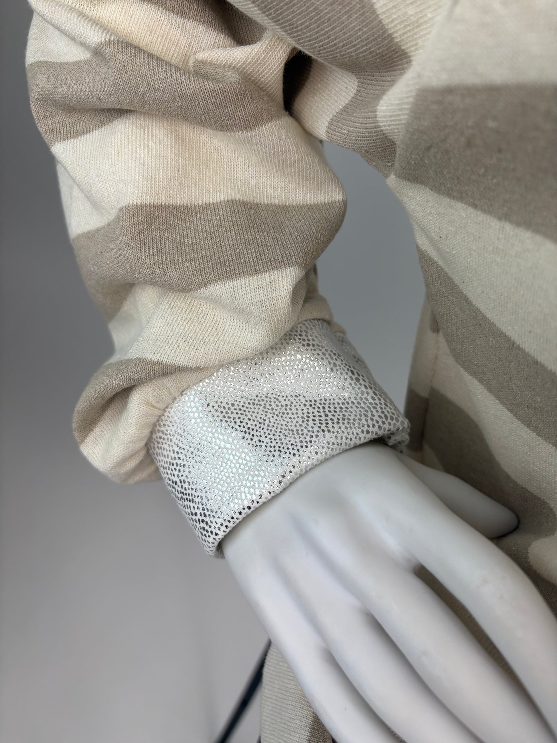 Der Rundhalsausschnitt, die Ärmelbündchen sowie der untere Saum sind mit einem schimmernden, silberfarbenen Besatz versehen, der dem Pullover eine edle Note verleiht. Perfekt kombinierbar zu Jeans oder Stoffhosen – ideal für den Alltag oder einen gemütlichen Stadtbummel.