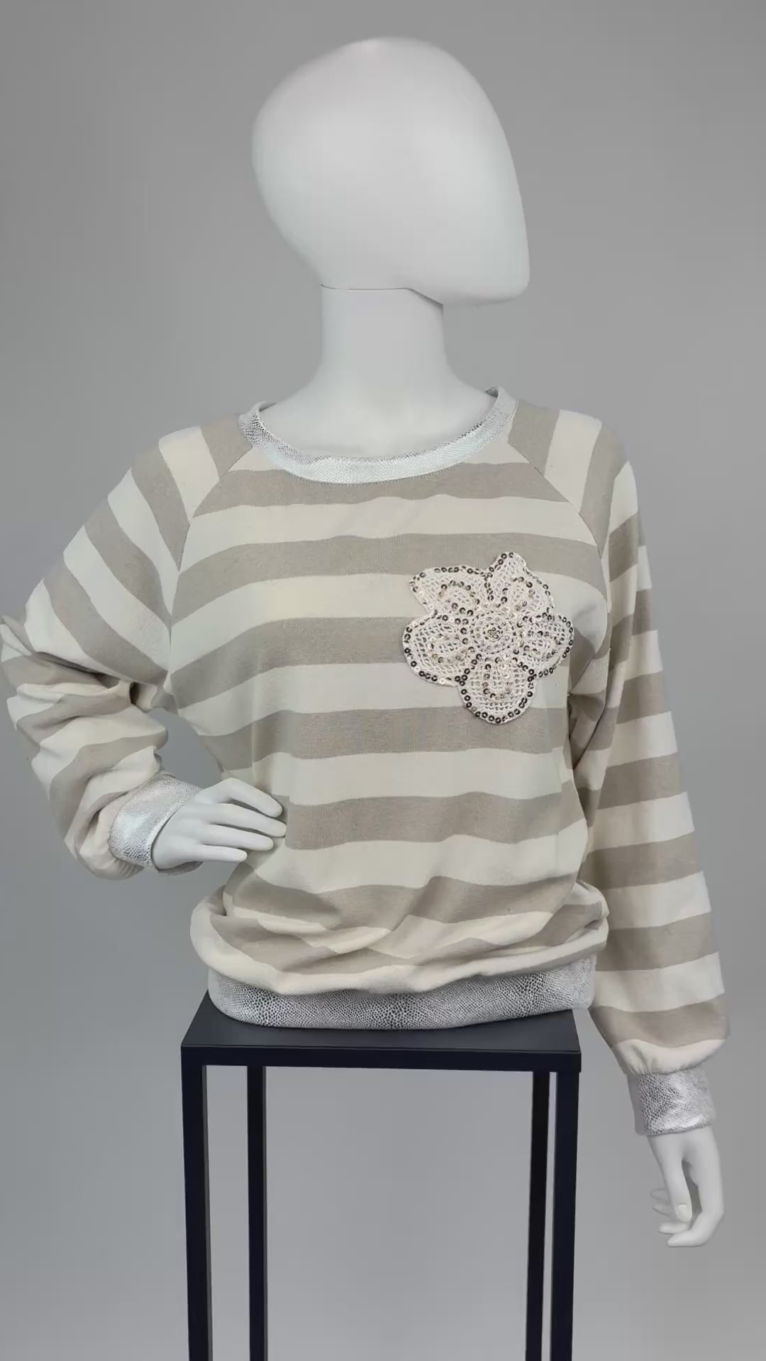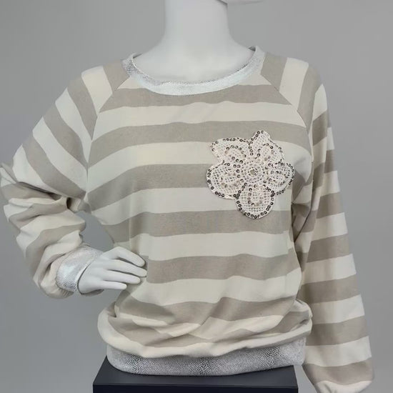 Gestreifter Pullover mit Paillettenblume, Gr. 36-42