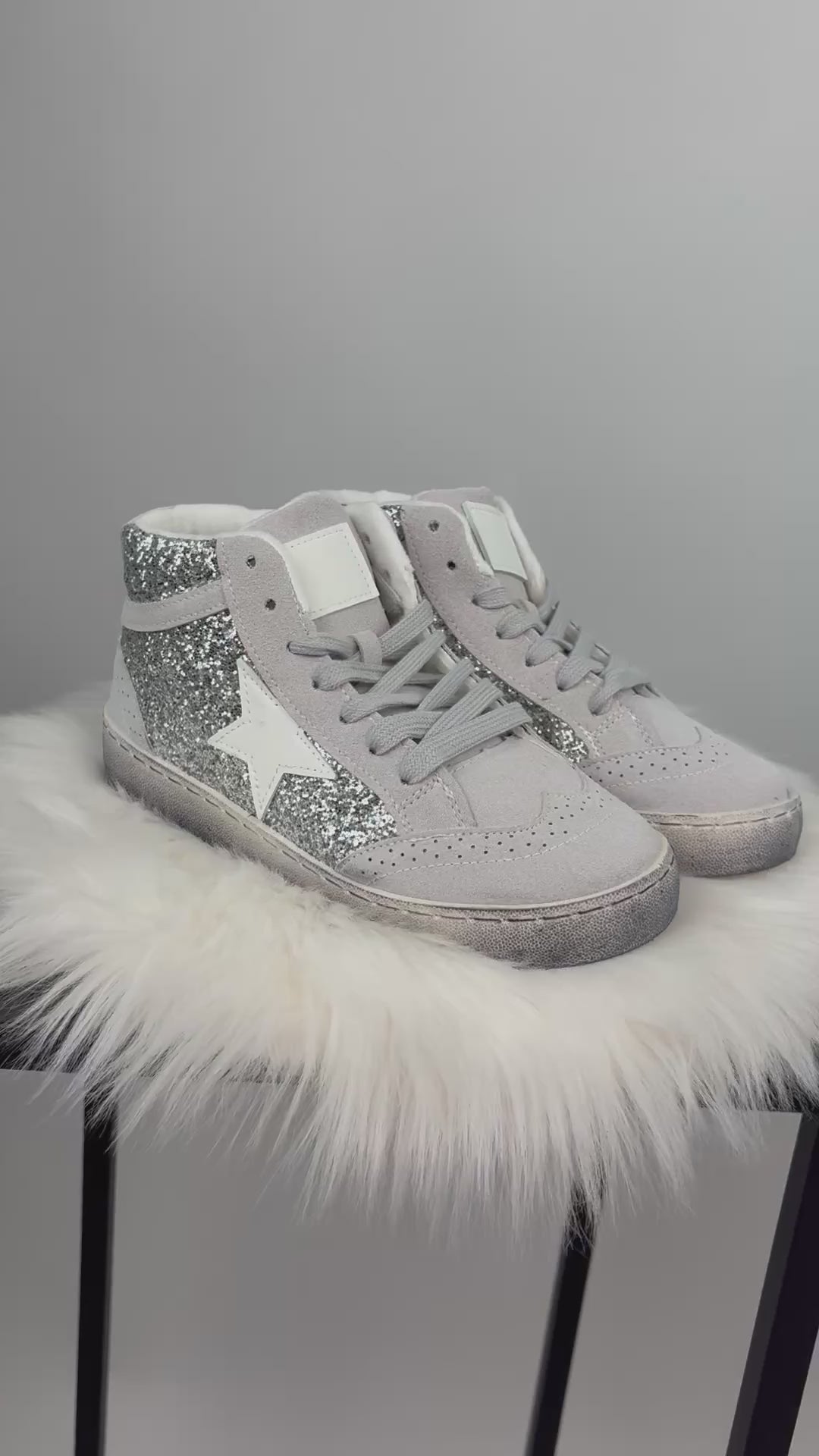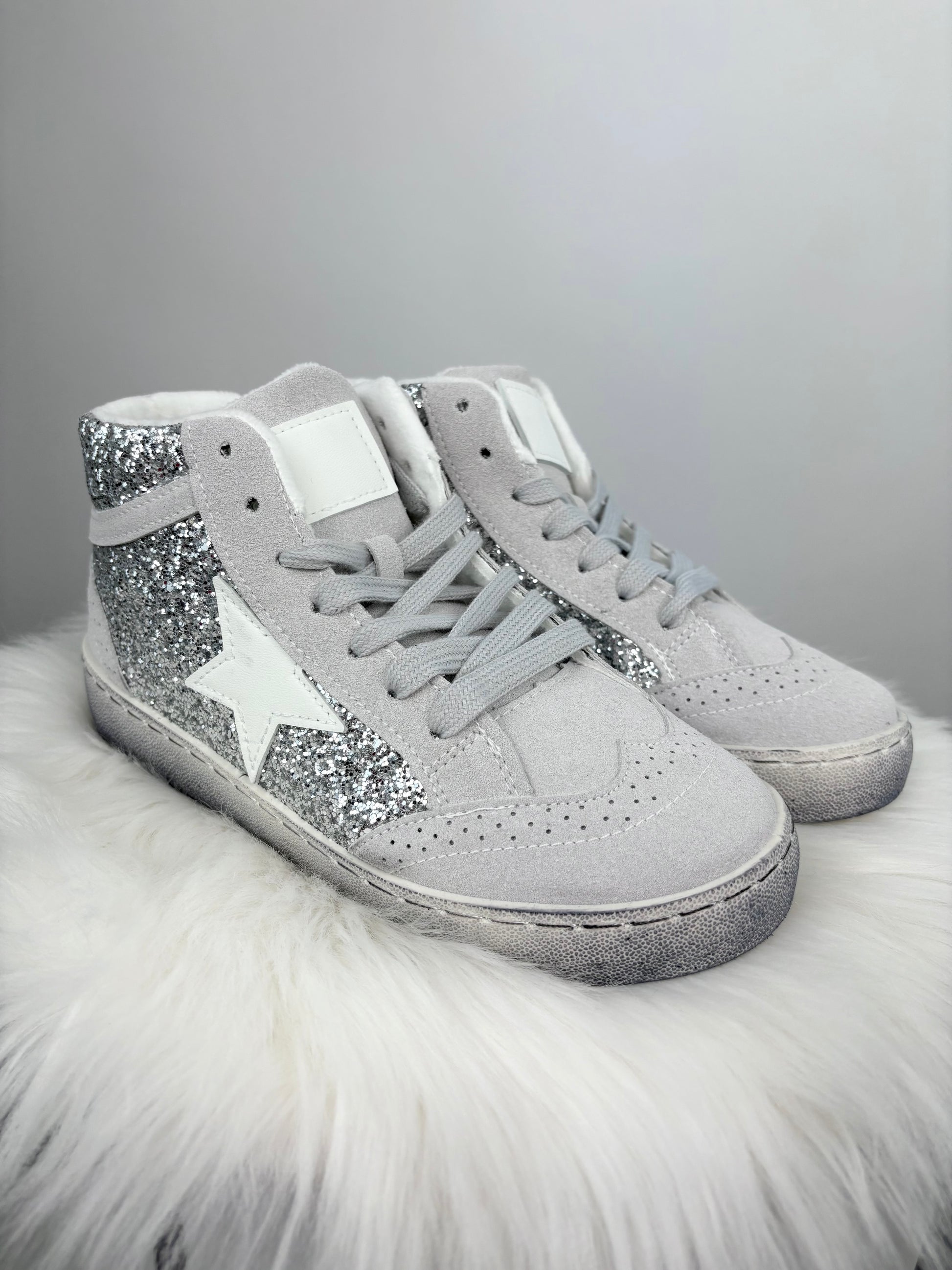 Dieser trendige High-Top Sneaker sorgt mit seiner funkelnden Glitzeroptik für einen echten Hingucker-Moment. Der seitliche Stern und die glitzernden Einsätze verleihen dem Schuh einen coolen, modernen Look - perfekt für alle, die ihre Outfits gerne mit etwas Glam aufwerten. Der hohe Schaft bietet zusätzlichen Halt, während die weich gepolsterte Sohle für angenehmen Tragekomfort sorgt. Ein Must-Have für stylische Alltagslooks oder besondere Anlässe. Angesagter Used-Look. Der Schuh ist innen kuschelig leicht gefüttert.