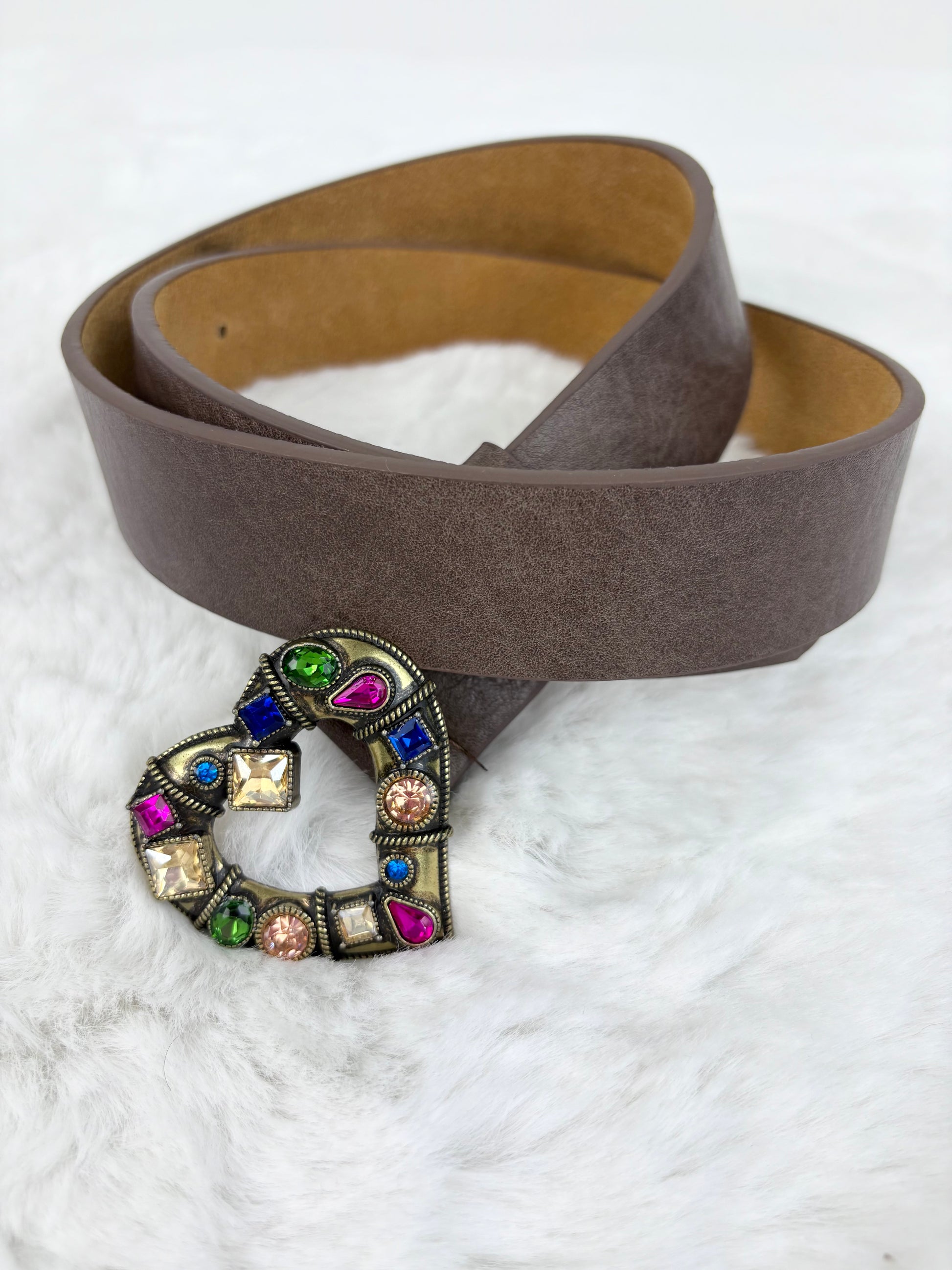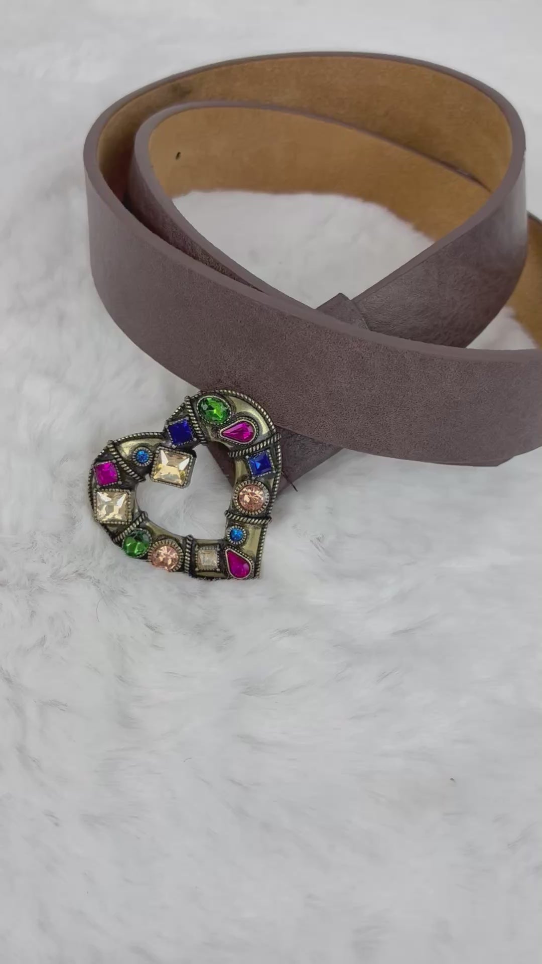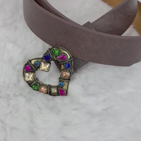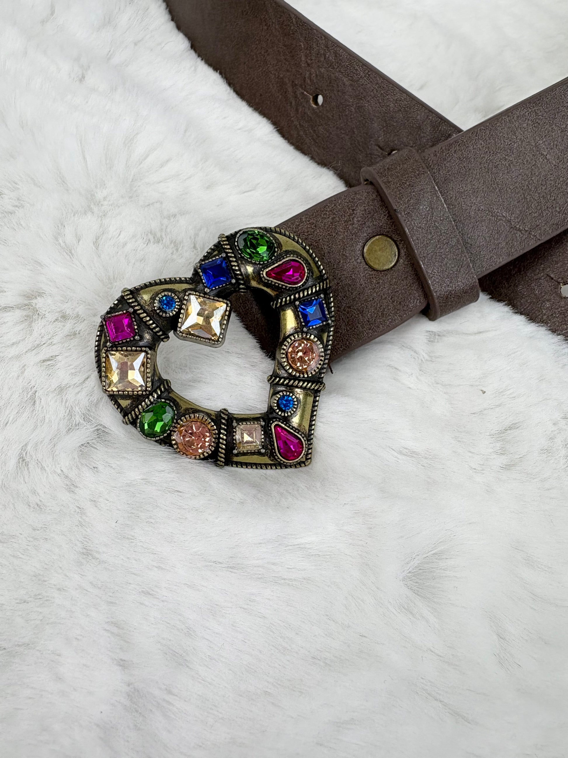 Der hochwertige Gürtel in elegantem Braun wird durch eine auffällige Herz-Schnalle zum echten Blickfang. Die Schnalle ist mit funkelnden Schmucksteinen in verschiedenen Farben und Formen besetzt – von leuchtendem Pink über sattes Grün bis hin zu edlem Blau und zartem Champagner-Ton.