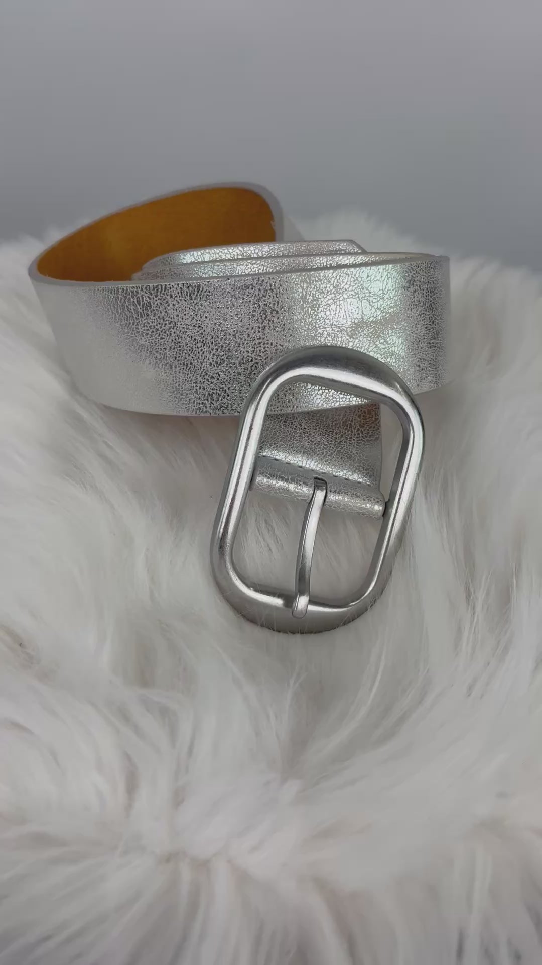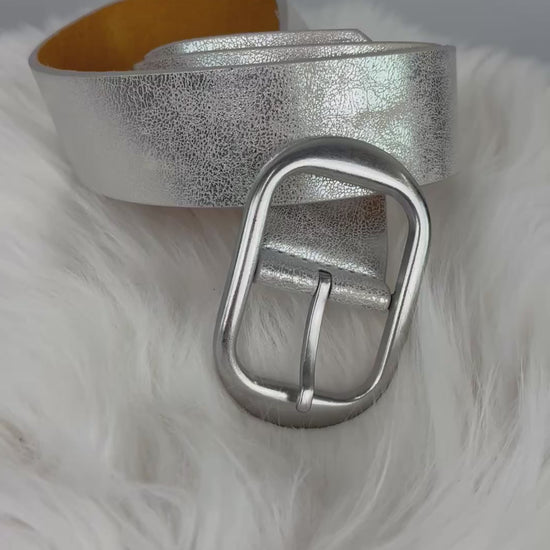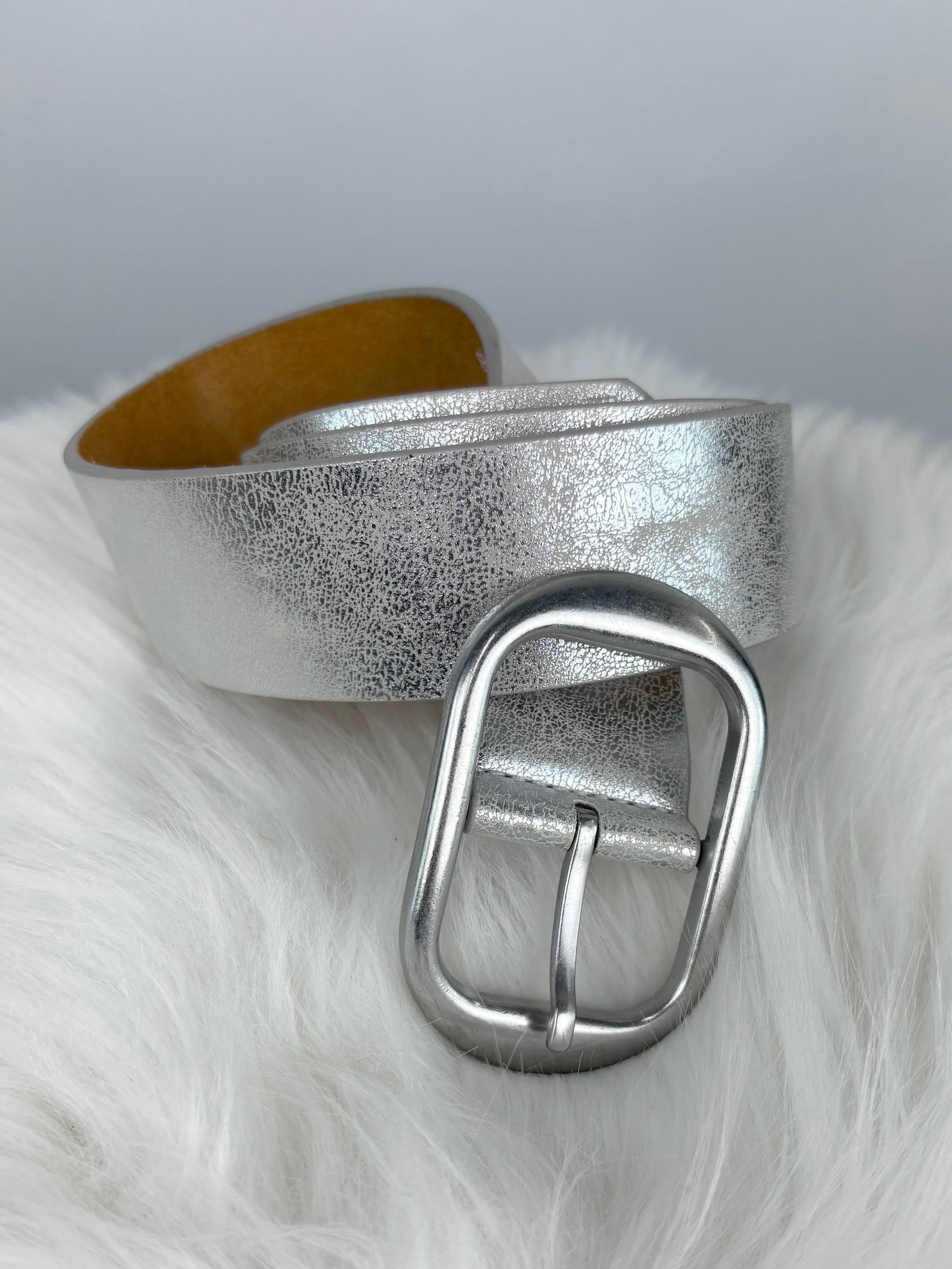 Dieser Gürtel in glänzendem Silber ist ein echter Hingucker und verleiht jedem Outfit einen fischen, modischen Akzent. Er besteht aus einem glatten, hochwertigen Material und ist mit einer robusten silberfarbenen Metallschnalle ausgestattet.