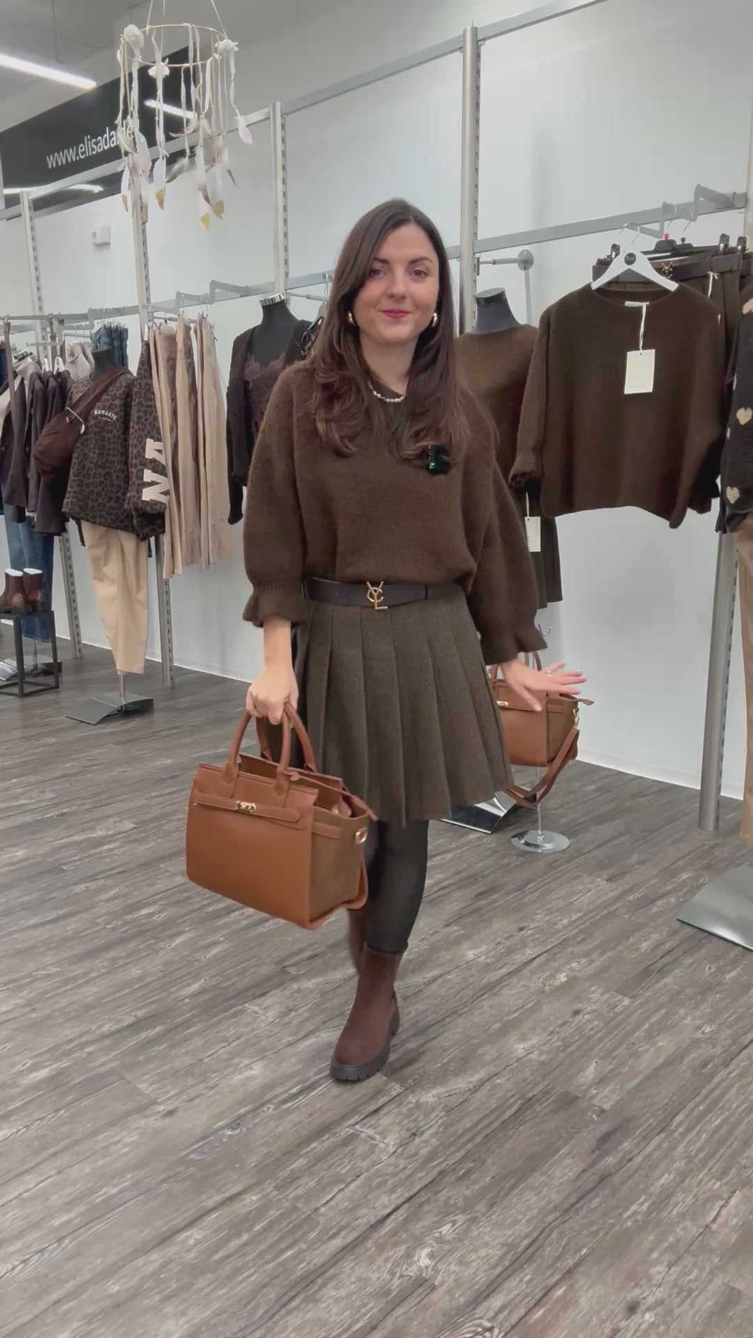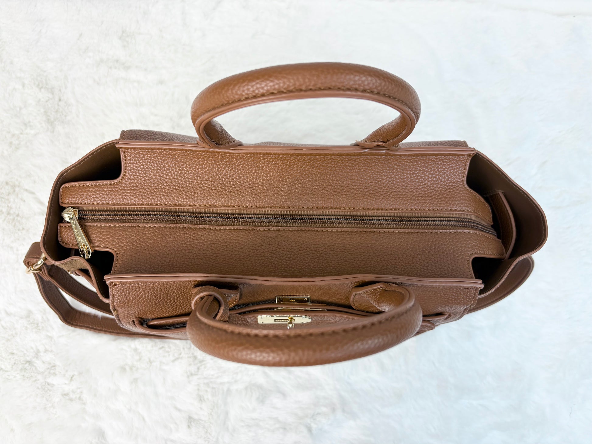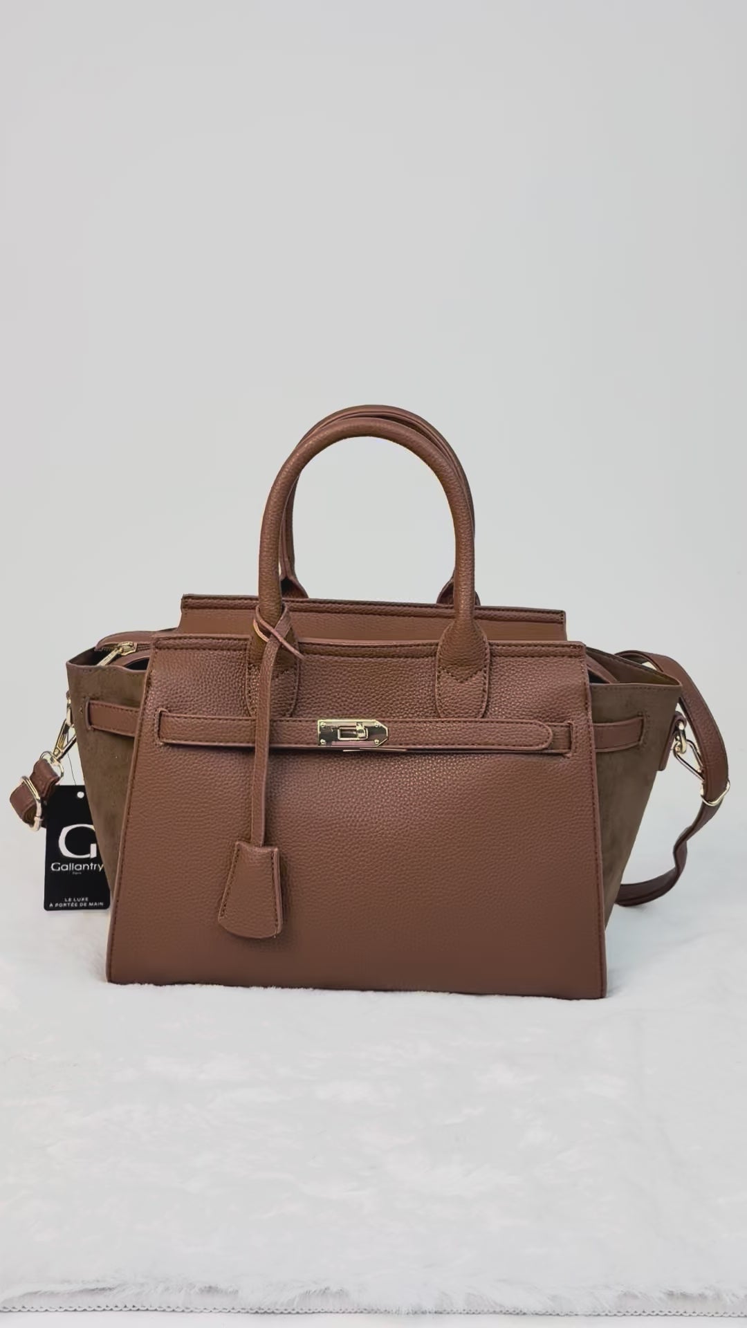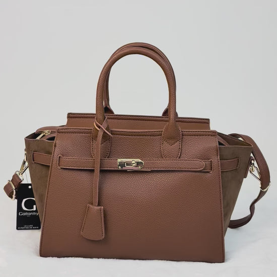 Diese stilvolle Handtasche in edlem Maronenbraun vereint klassisches Design mit moderner Funktionalität. Hergestellt aus hochwertigem, fein genarbtem Kunstleder, bietet sie eine luxuriöse Haptik. Die Tasche besticht durch ihre strukturierte Form, goldfarbene Metallelemente und einen eleganten Riemenverschluss. Im Set enthalten ist eine passende kleine Innentasche. Neben den stabilen Henkeln verfügt sie über einen abnehmbaren, verstellbaren Schulterriemen.