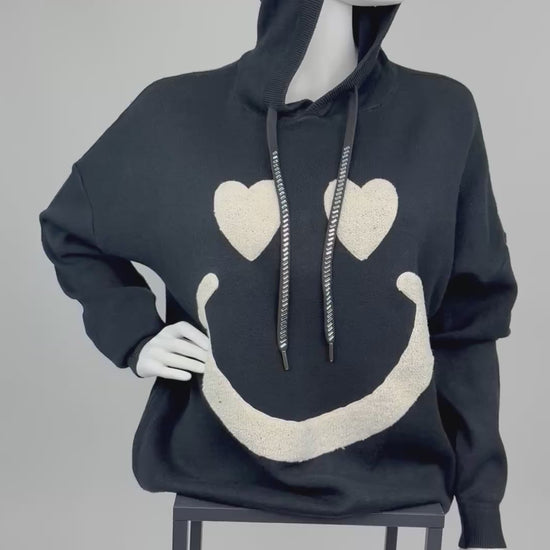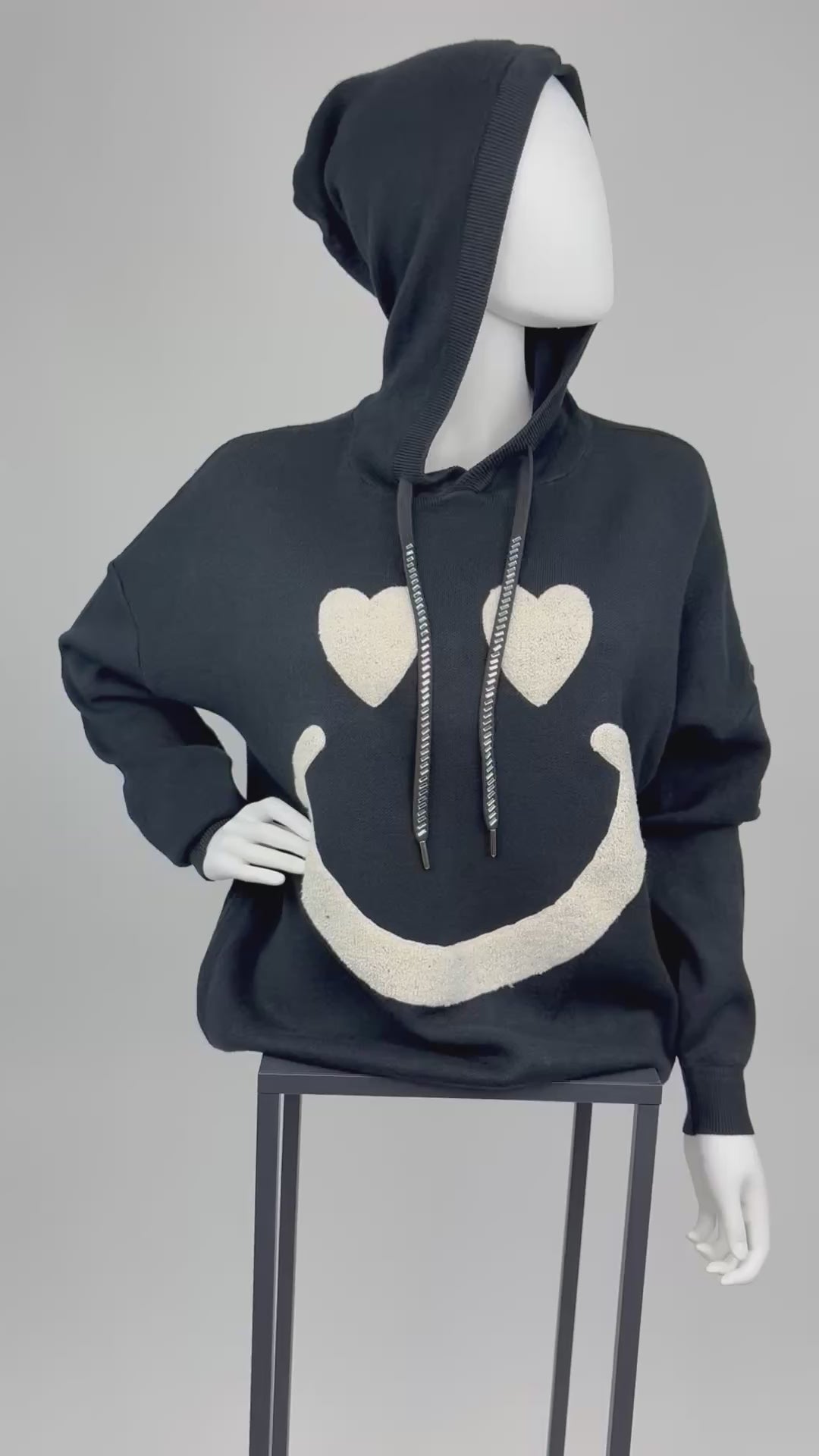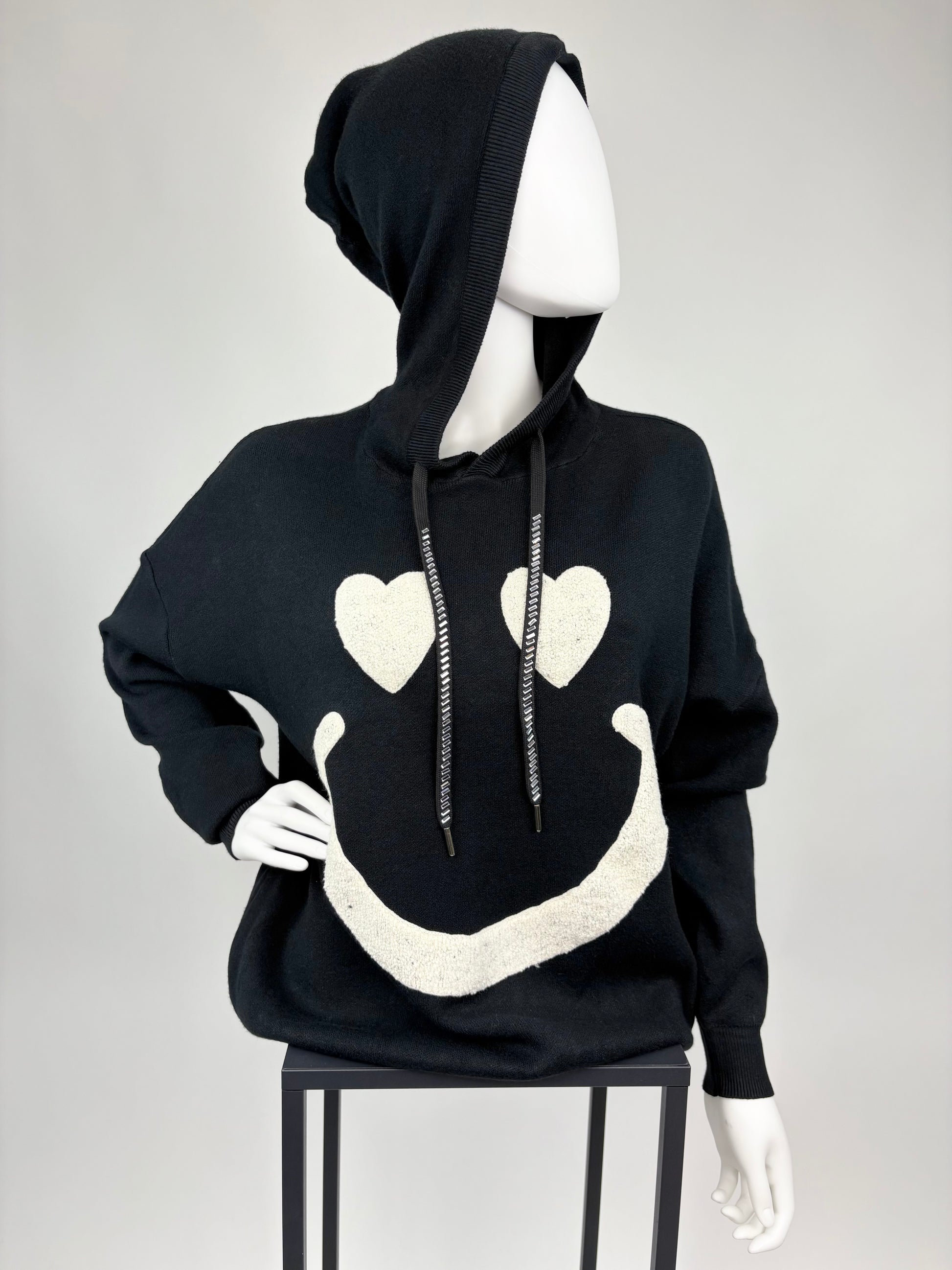 Dieser kuschelige Hoodie ist ein echtes Wohlfühlteil mit süßem Eyecatcher-Design. Auf der Vorderseite prangt ein großes Smiley-Gesicht mit Herz-Augen, das sofort gute Laune verbreitet. Mit seiner lockeren Passform, der Kapuze mit Kordelzug inklusive Glitzerdetails und dem weichen Material ist er perfekt für entspannte Tage zu Hause oder lässige Streetwear-Outfits.