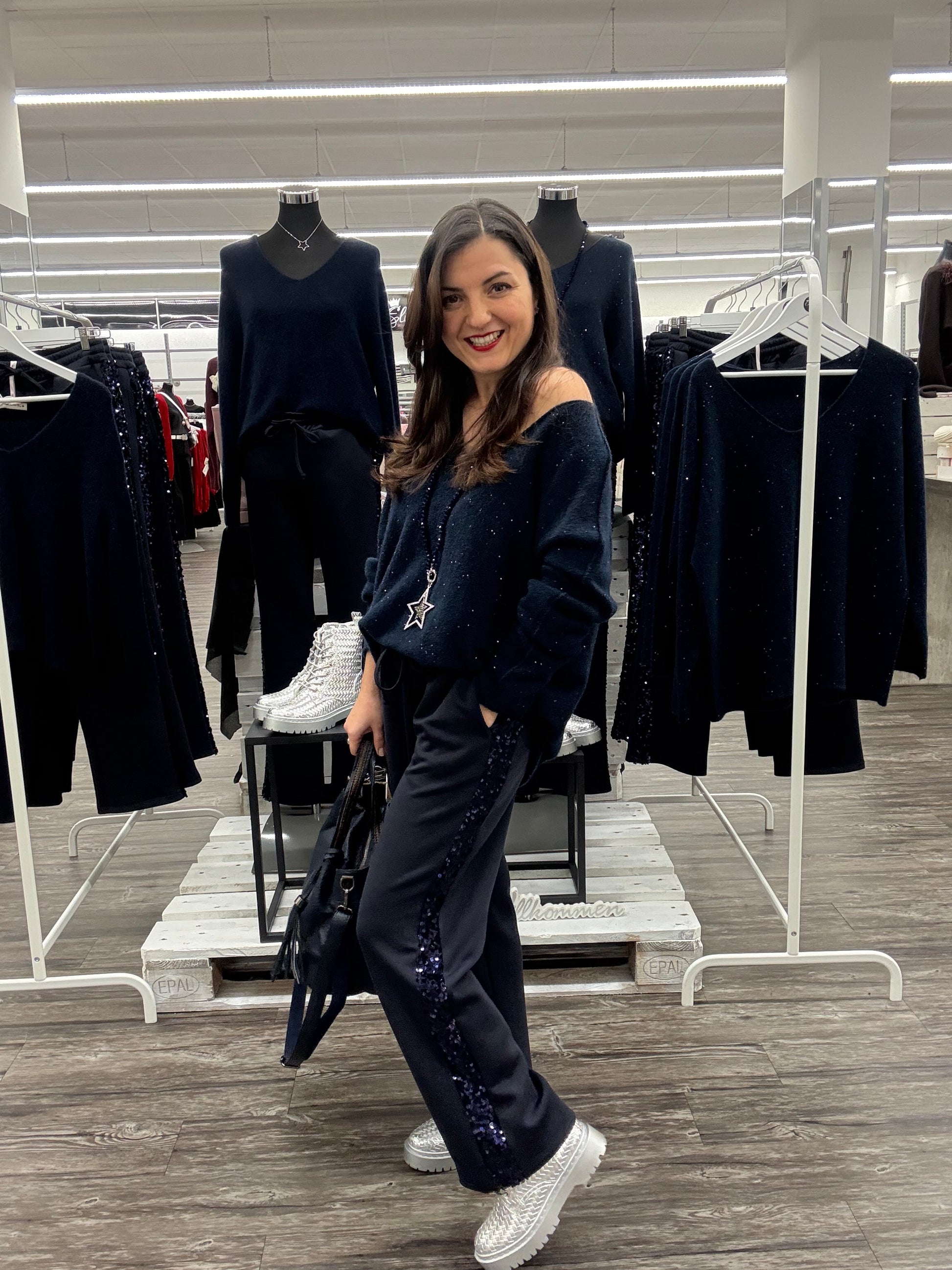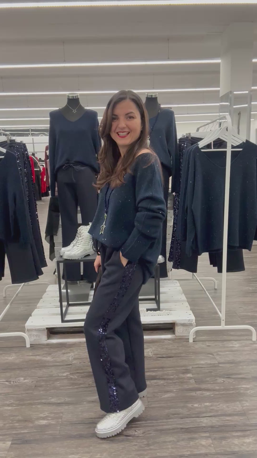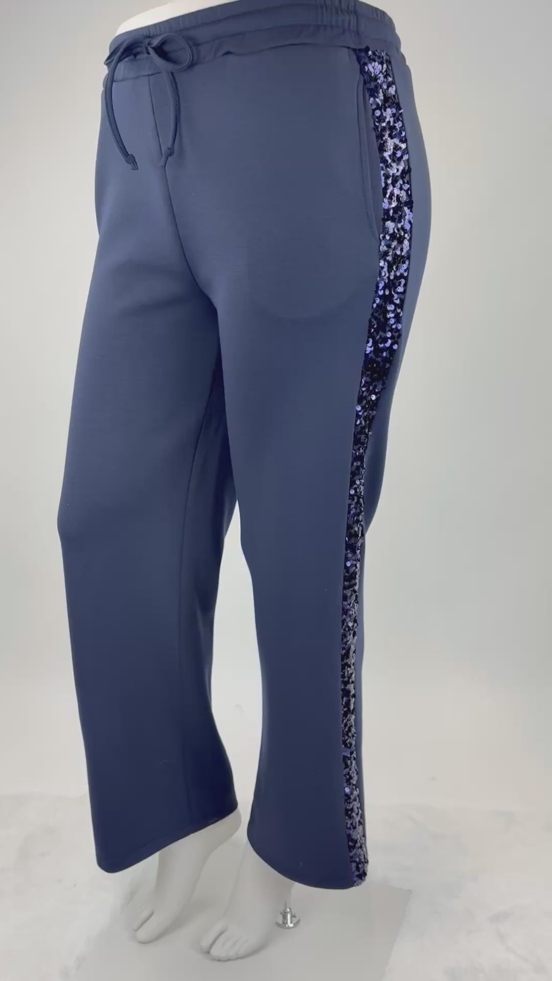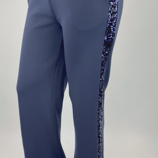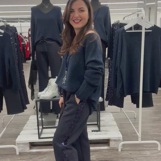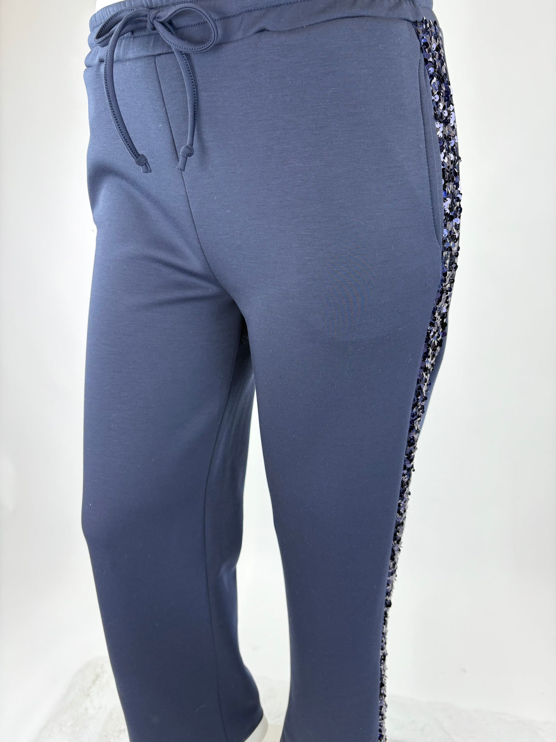 Diese modische Joggerpants verbindet sportlichen Komfort mit einem Hauch von Glamour. Der seitliche Paillettenstreifen verleiht der Hose einen edlen Look und macht sie zum idealen Begleiter – ob für entspannte Freizeitmomente oder stylische Casual-Outfits.