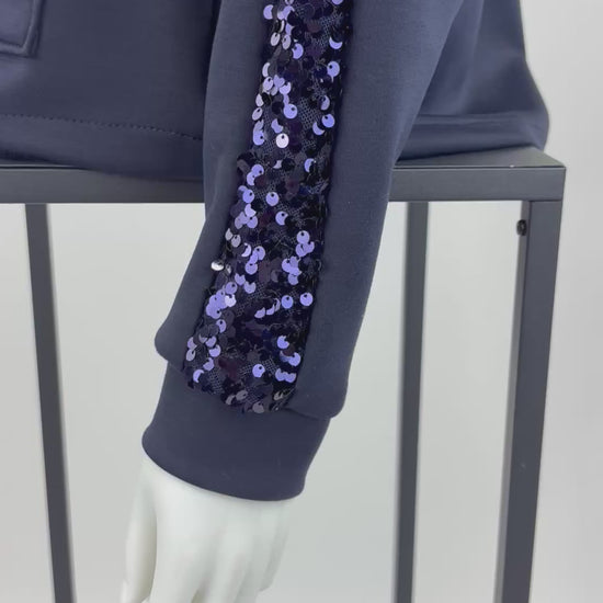 Diese stylische Sweatjacke kombiniert sportlichen Komfort mit einem Hauch Glamour. Der gerade Schnitt und der weiche Sweatstoff sorgen für ein angenehmes Tragegefühl, während die Ärmel mit funkelnden Pailletten zum echten Blickfang werden.