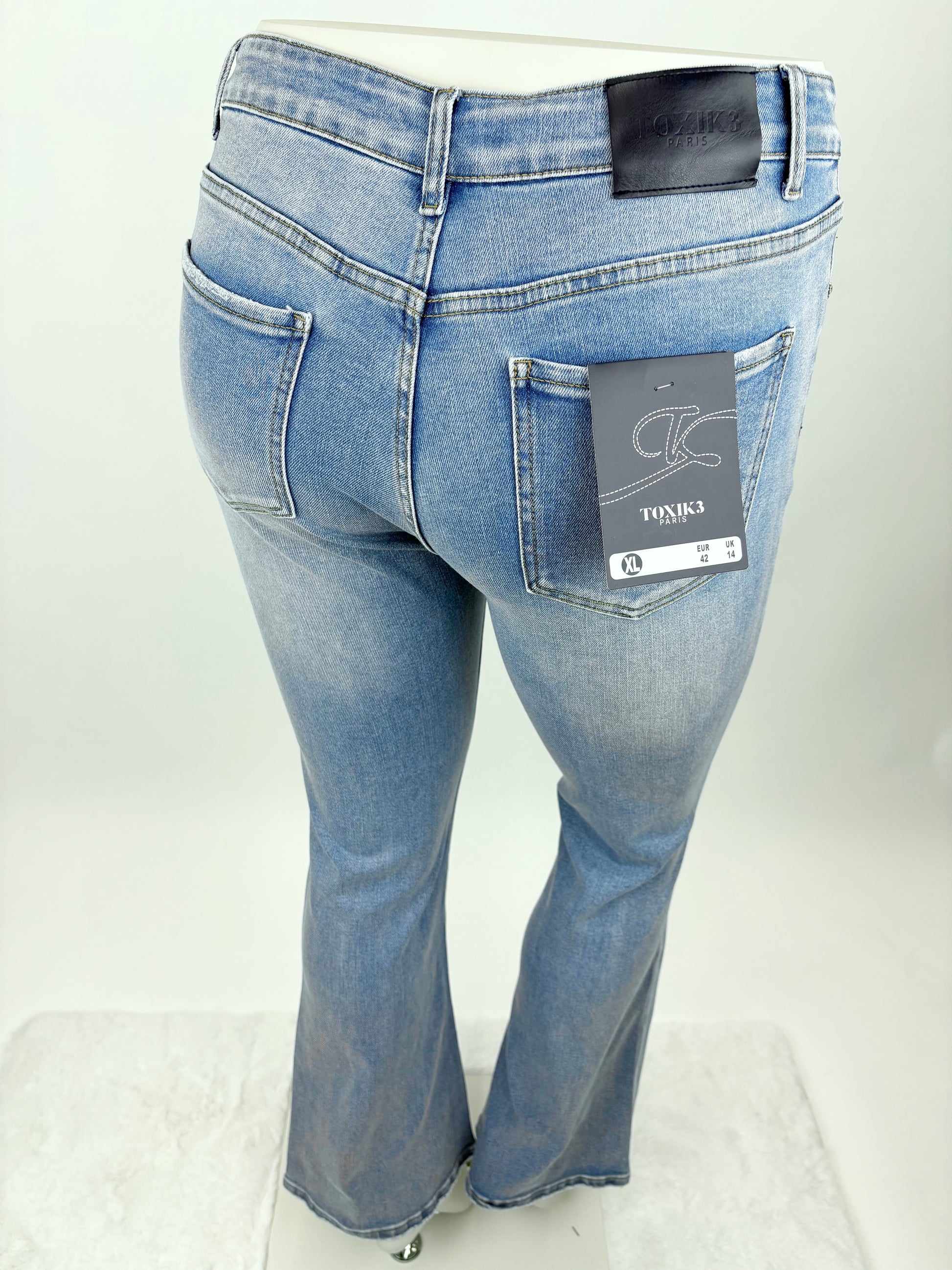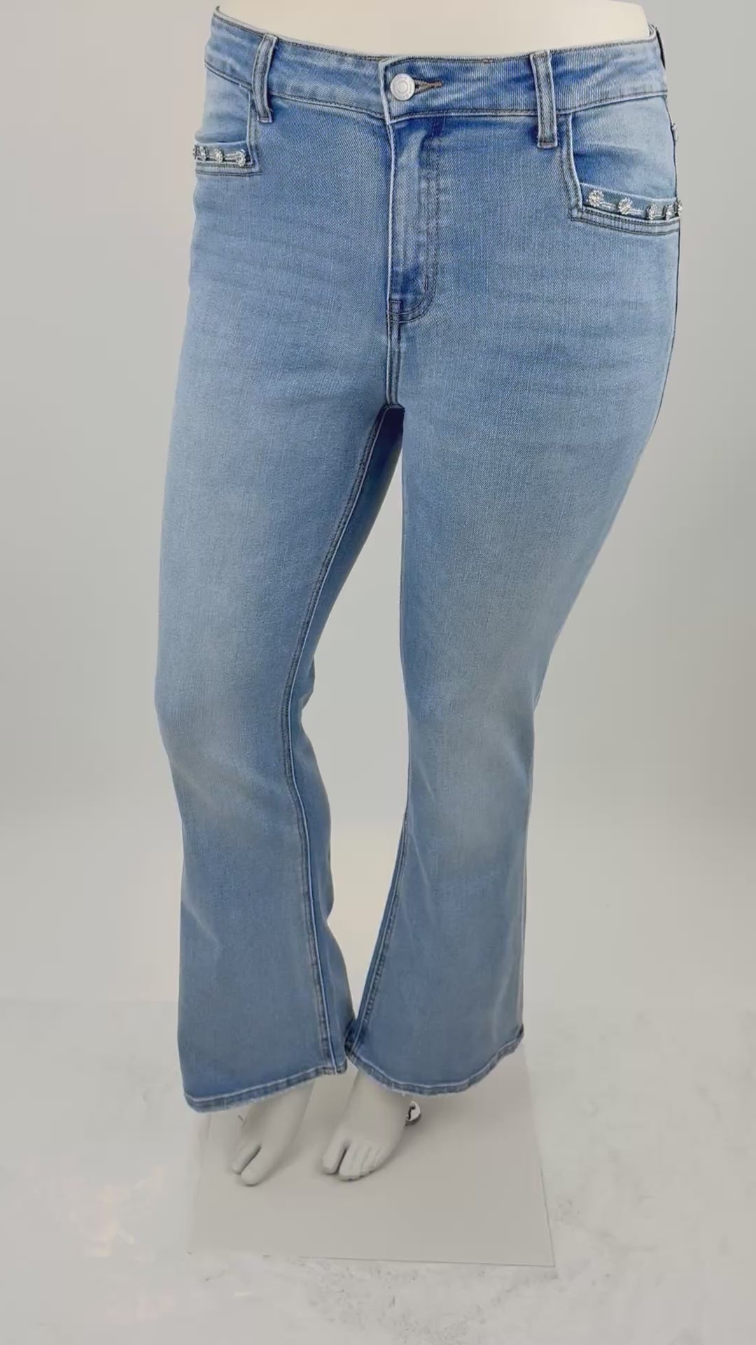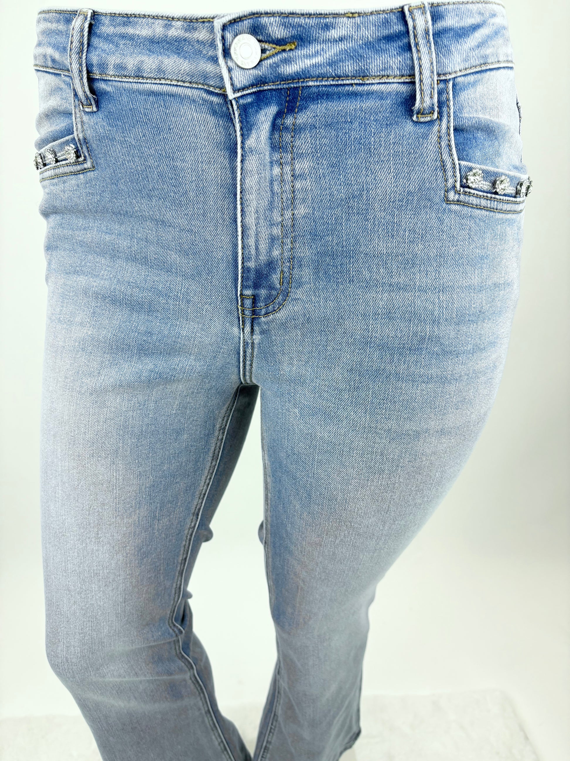 Diese klassische Jeans in hellem Denim-Ton überzeugt mit ihrem bequemen Stretch-Material und der figurbetonten Passform. Das besondere Highlight: die funkelnden Strass-Details an den Taschen, die dem Look einen edlen und femininen Touch verleihen.