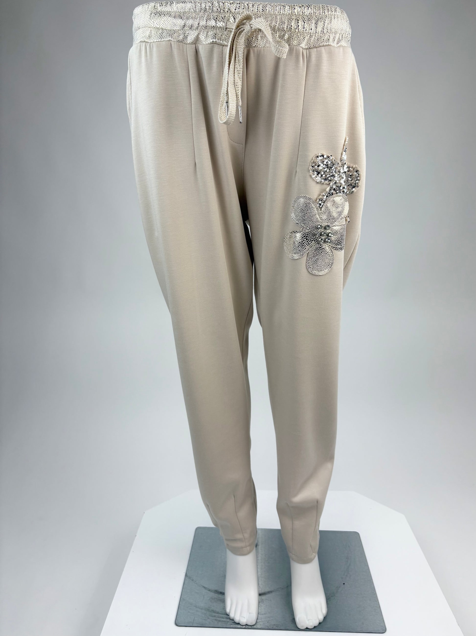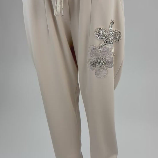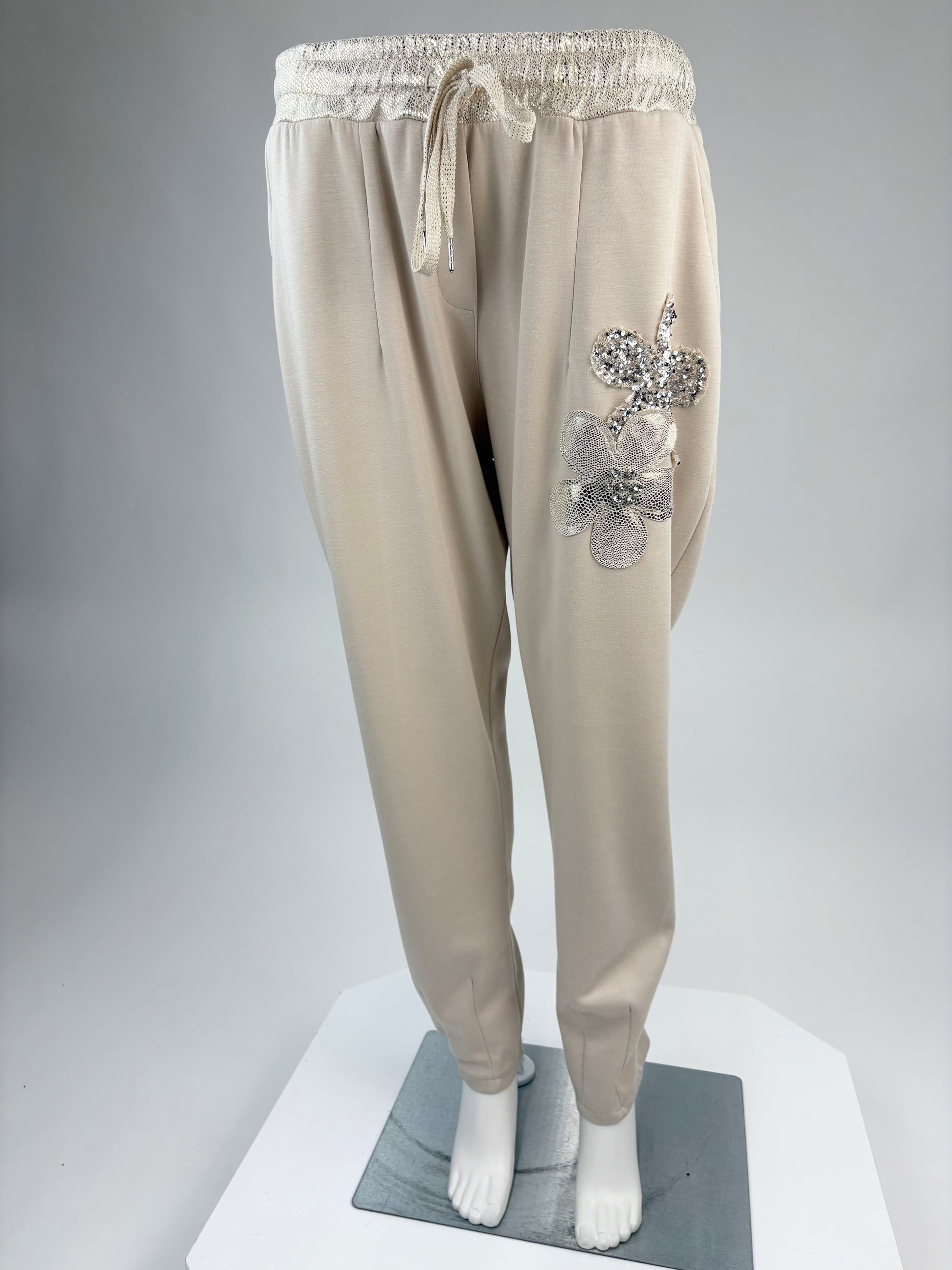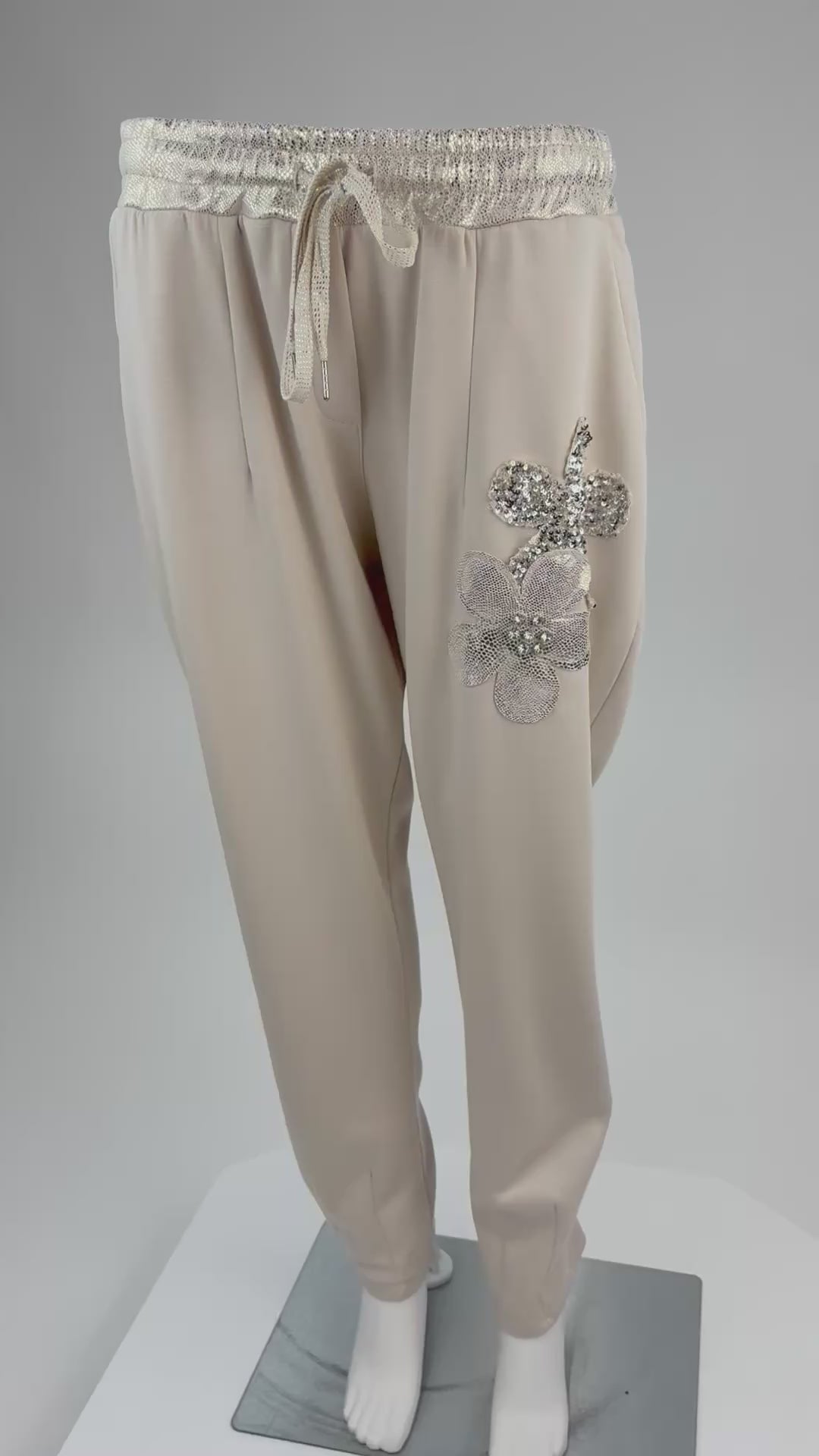 Diese edlen Joggerpants vereinen ultimativen Komfort mit einem Hauch von Glamour. Der breite, elastische Bund mit funkelnden Pailletten sorgt für einen sicheren Sitz und ein stylisches Highlight. Besonders ins Auge fällt die detailverliebte Blumenapplikation mit Glitzer- und Netz-Elementen – ein echter Hingucker!