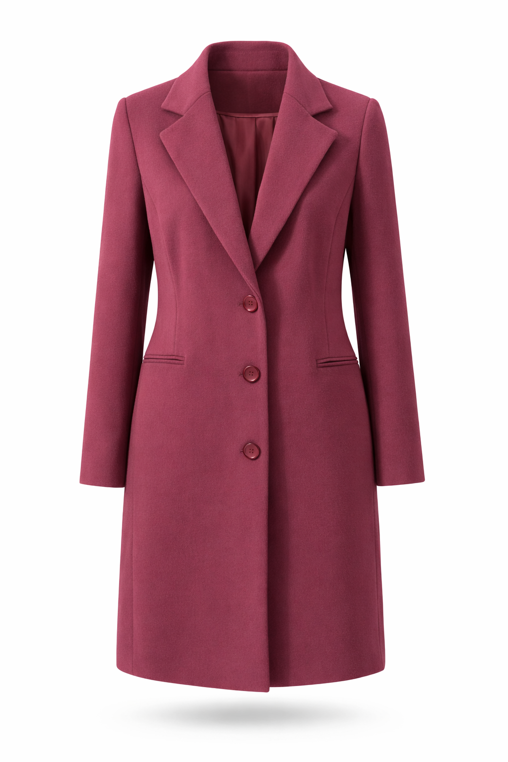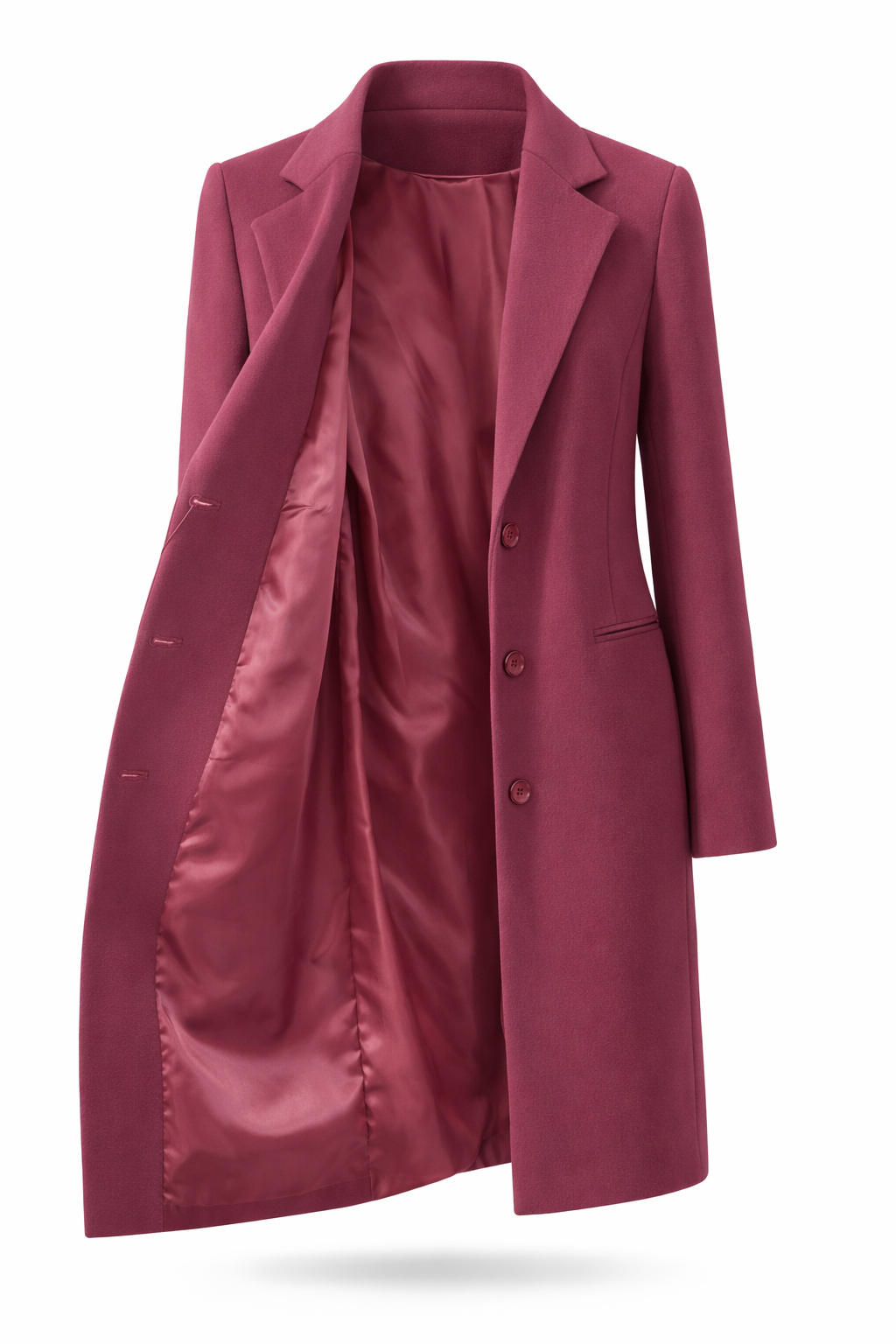 Das edle Bordeaux verleiht dem Design eine feminine, moderne Ausstrahlung, während der Reverskragen und die einreihige Knopfleiste den eleganten Charakter unterstreichen. Die glatte Innenfütterung sorgt für ein angenehmes Tragegefühl und erleichtert das An- und Ausziehen. Dezente Leistentaschen runden das Gesamtbild harmonisch ab.