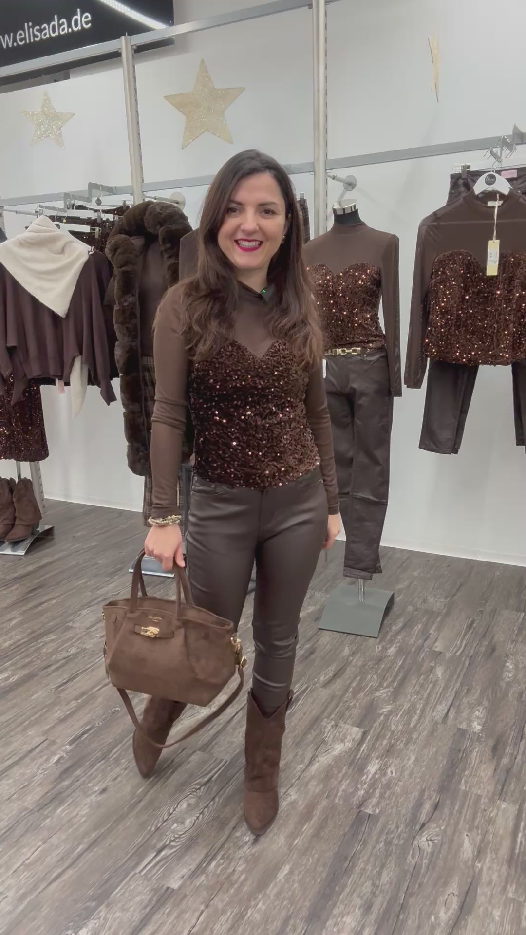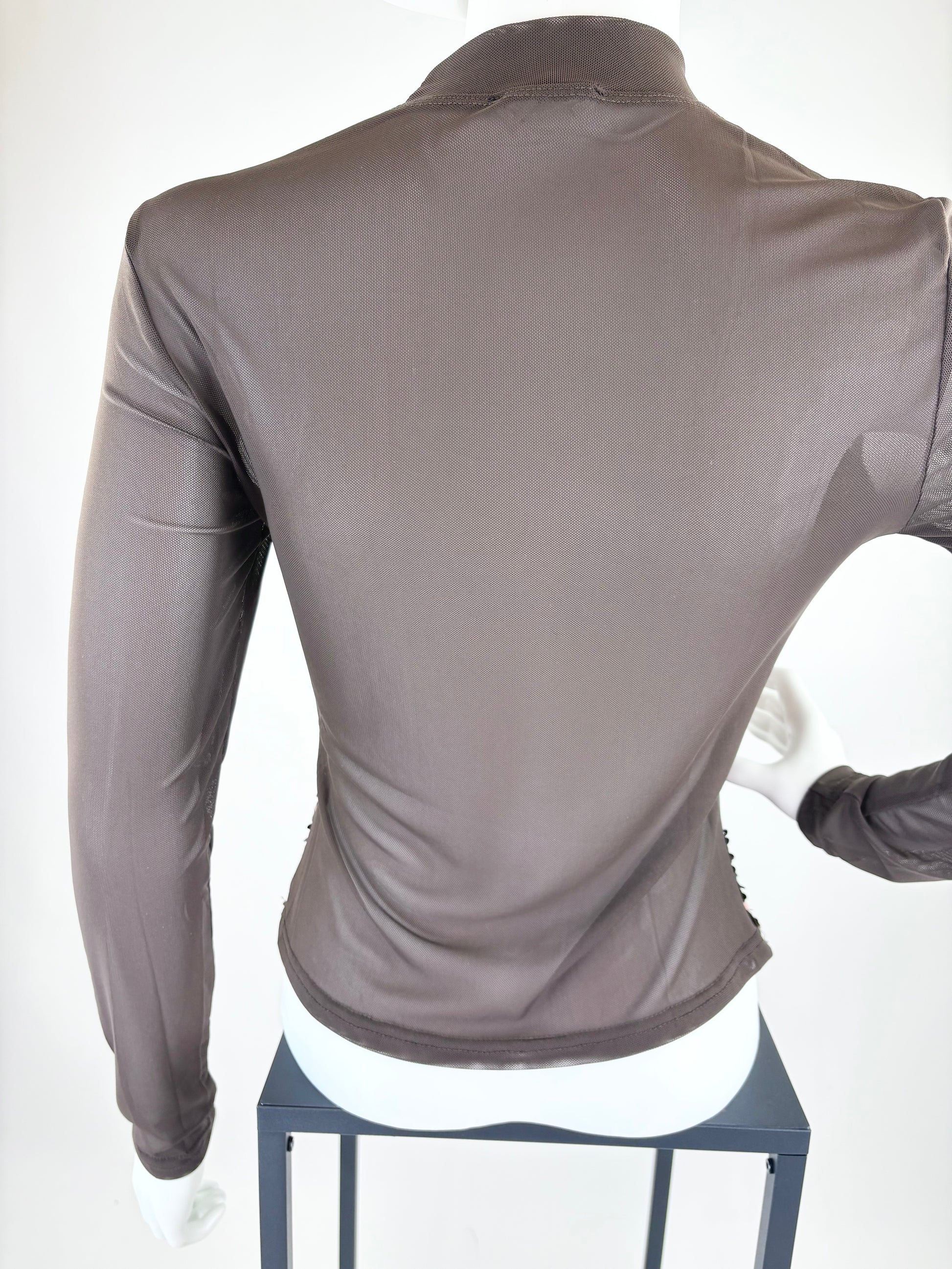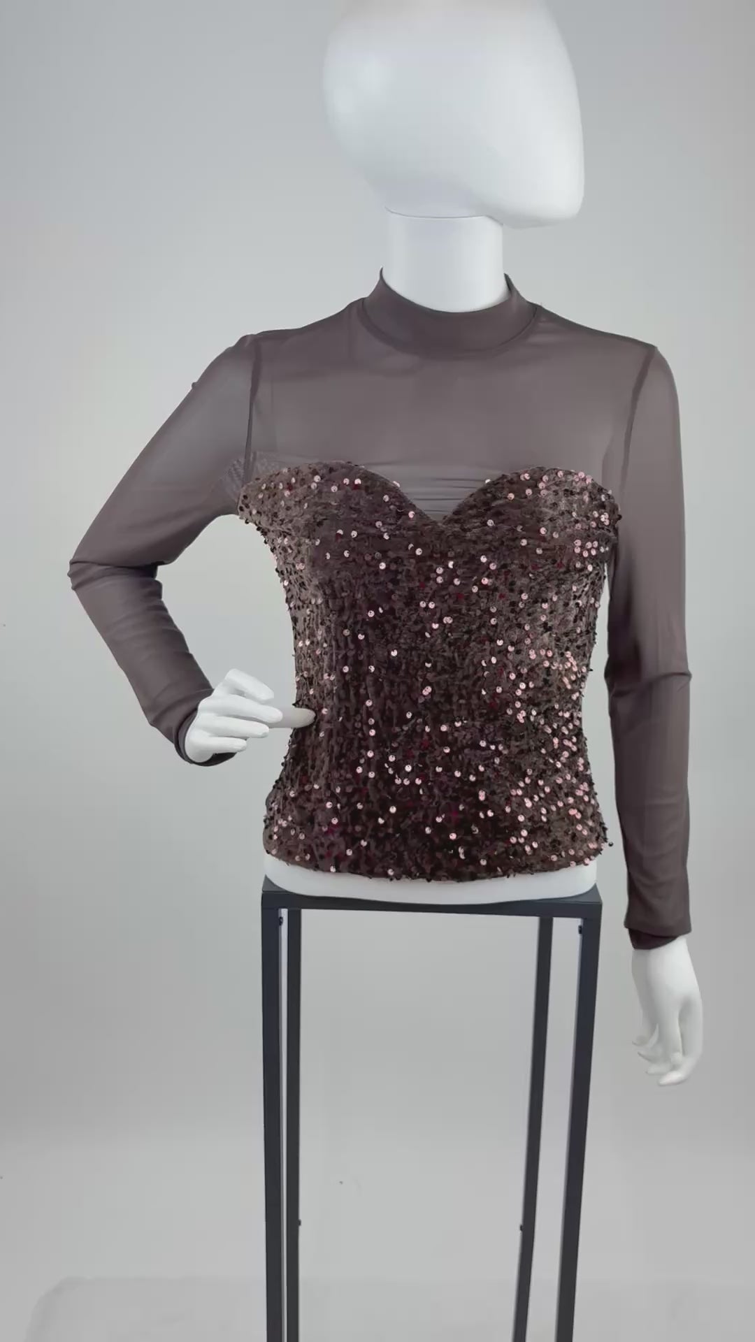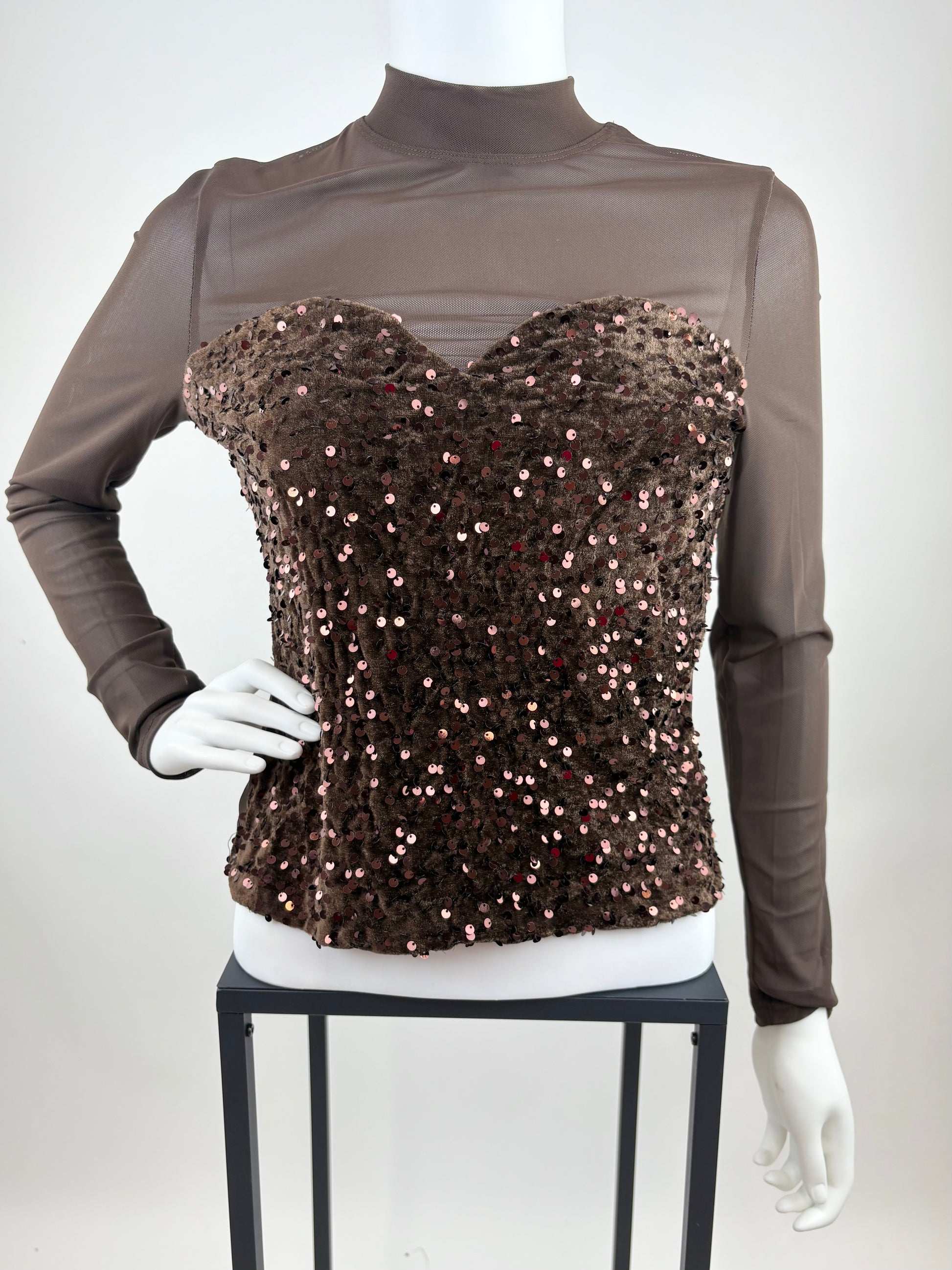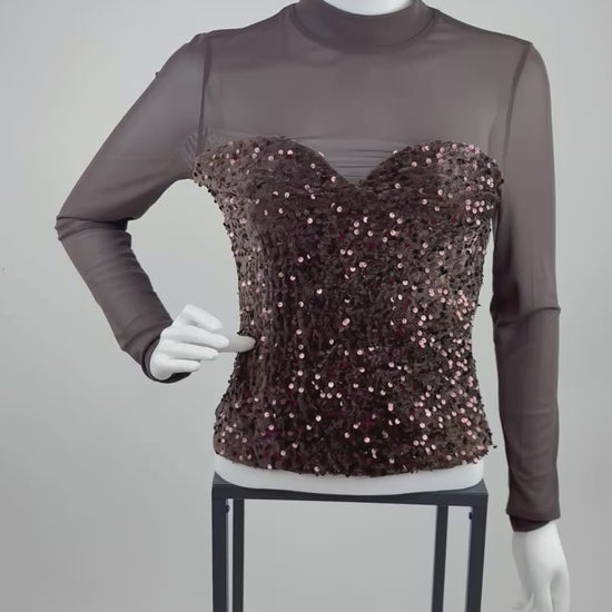 Dieses Oberteil kombiniert transparente Mesh-Elemente mit einer aufwendig gestalteten, paillettenbesetzten Vorderseite im Corsagen-Stil. Der hohe Mesh-Hals und die langen, halbtransparenten Ärmel verleihen dem Design eine moderne, elegante Linie, während die eng anliegende Passform die Figur betont. Die Paillettenfront in einem warmen Braunton sorgt für einen edlen Schimmer und macht das Oberteil ideal für Abendlooks, Events oder besondere Anlässe. Durch das Zusammenspiel aus schlichter Transparenz und glitzerndem Highlight entsteht ein klarer, stilvoller Kontrast.