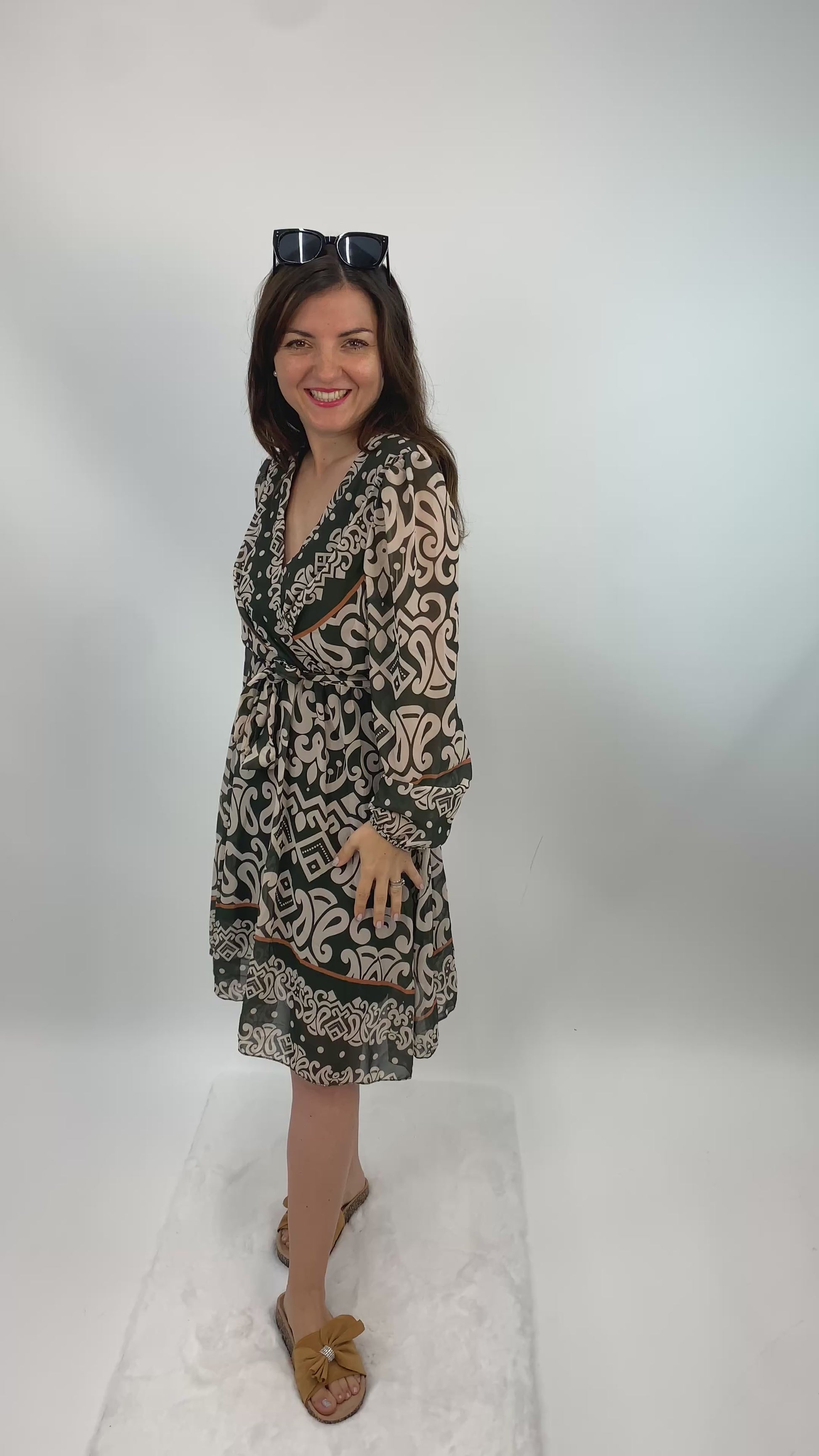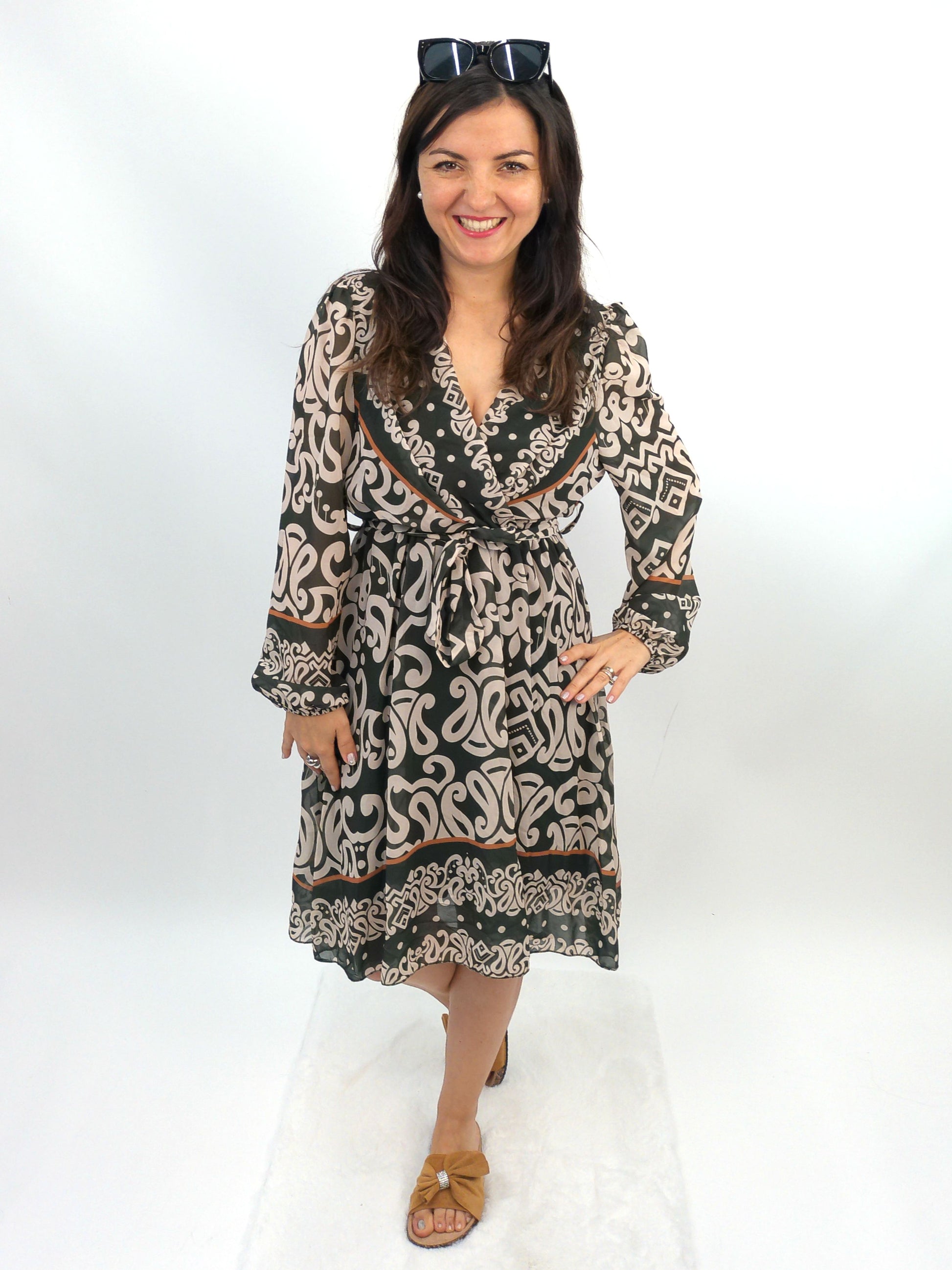 Dieses elegante Midikleid mit auffälligem Ethno-Muster ist ein echter Blickfang. Das Oberteil hat eine feminine Wickeloptik, die ein schönes Dekolleté zaubert. Dank des schmalen Gummizugs in der Taille sowie dem kleinen Gürtel sitzt es bequem und betont deine Figur. Besonders edel sind die transparenten langen Ärmel, die locker fallen und an den Enden mit elastischen Bündchen abschließen, sowie der leicht transparente Rücken, der dem Kleid eine elegante, leicht verführerische Note verleiht. Der Rockteil ist leicht ausgestellt und fällt fließend.