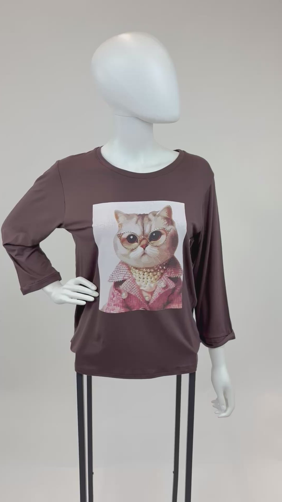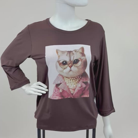 Stylisch, bequem und mit einem Hauch Humor – dieses Damen-Shirt ist ein echter Hingucker! Das Highlight ist der originelle Front-Print: eine elegante Katze im Blazer, mit Perlenkette und Sonnenbrille. Das Motiv verleiht dem Shirt einen modernen und zugleich verspielten Look. Durch den lockeren Schnitt und die 3/4-Ärmel eignet sich das Oberteil perfekt für den Alltag, Freizeit oder lässige Streetwear-Styles.