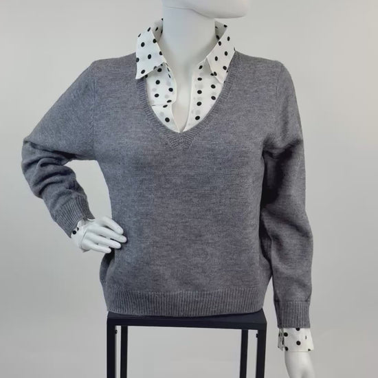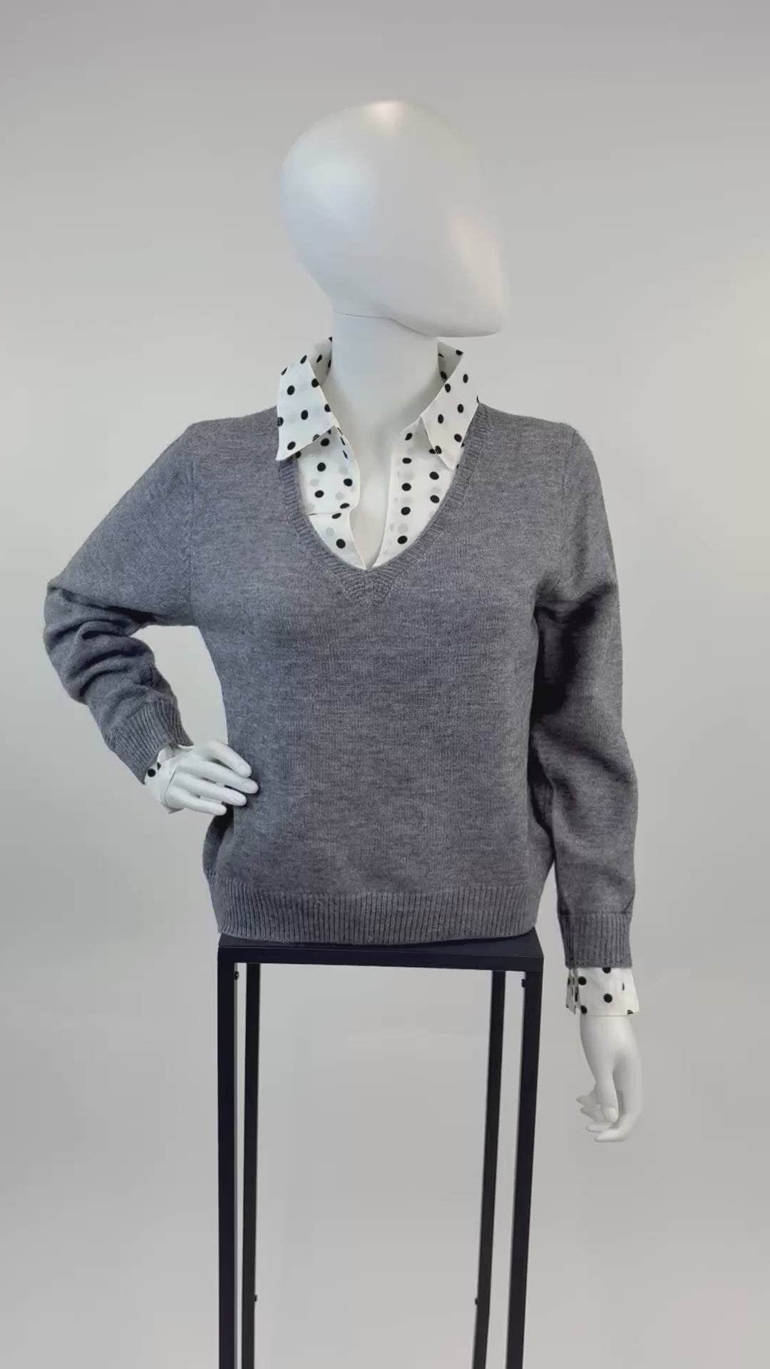Dieser Pullover im 2-in-1-Look kombiniert eleganten Blusenstil mit gemütlichem Strick. Der klassische V-Ausschnitt wird durch den eingenähten Polka-Dot-Kragen und die passenden Manschetten perfekt ergänzt – so entsteht ein stilvoller Lagenlook ganz ohne Aufwand. Ob fürs Büro, den Alltag oder ein entspanntes Dinner: Dieser Pullover sorgt immer für einen schicken Auftritt.