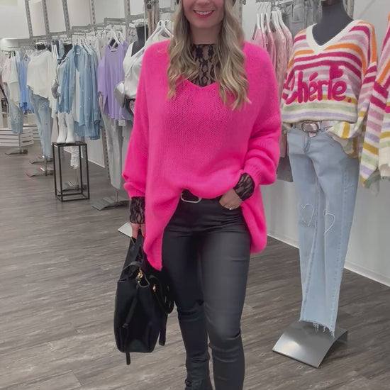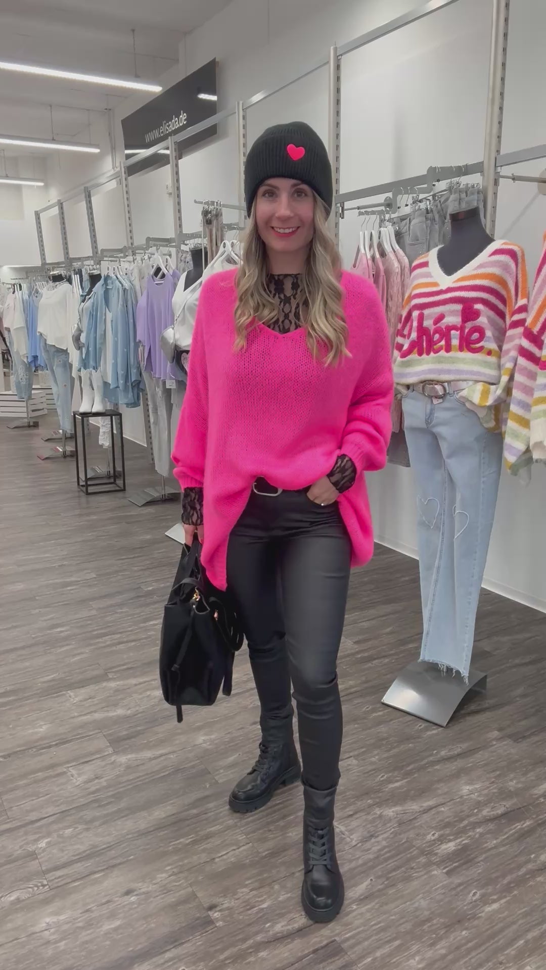 Ein echtes Statement-Piece für kühle Tage! Dieser weiche Pullover in kräftigem Pink vereint Komfort und Stil in einem. Das locker gestrickte Material fühlt sich angenehm auf der Haut an und sorgt für ein gemütliches Tragegefühl. Der V-Ausschnitt und die leicht überschnittenen Schultern verleihen dem Pullover eine lässige Silhouette, während die langen Ärmel mit Rippbündchen für zusätzlichen Komfort sorgen.