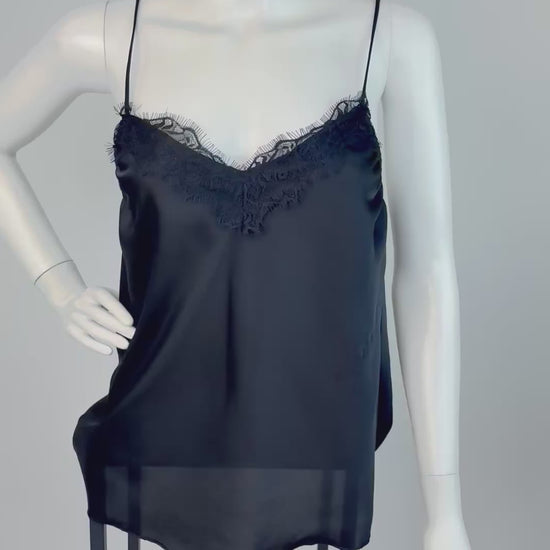 Das zarte Material mit leichtem Glanz schmiegt sich sanft an die Haut, während der feine Spitzeneinsatz am V-Ausschnitt für einen Hauch von Romantik sorgt. Die dünnen Spaghettiträger unterstreichen den eleganten, leichten Look. Ob solo getragen oder unter einem Blazer, Strickcardigan oder Lederjacke – dieses Top ist ein vielseitiges Must-have.