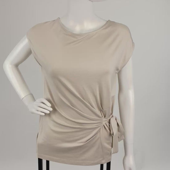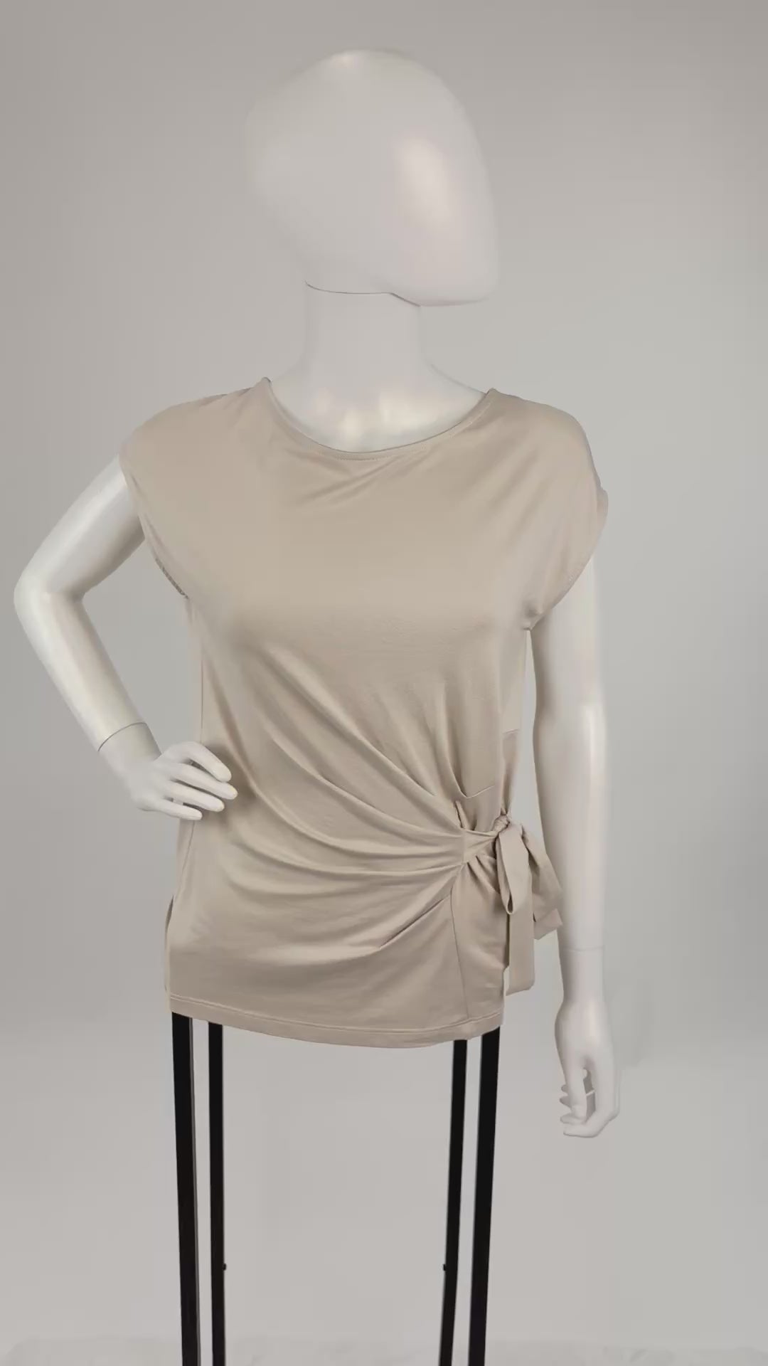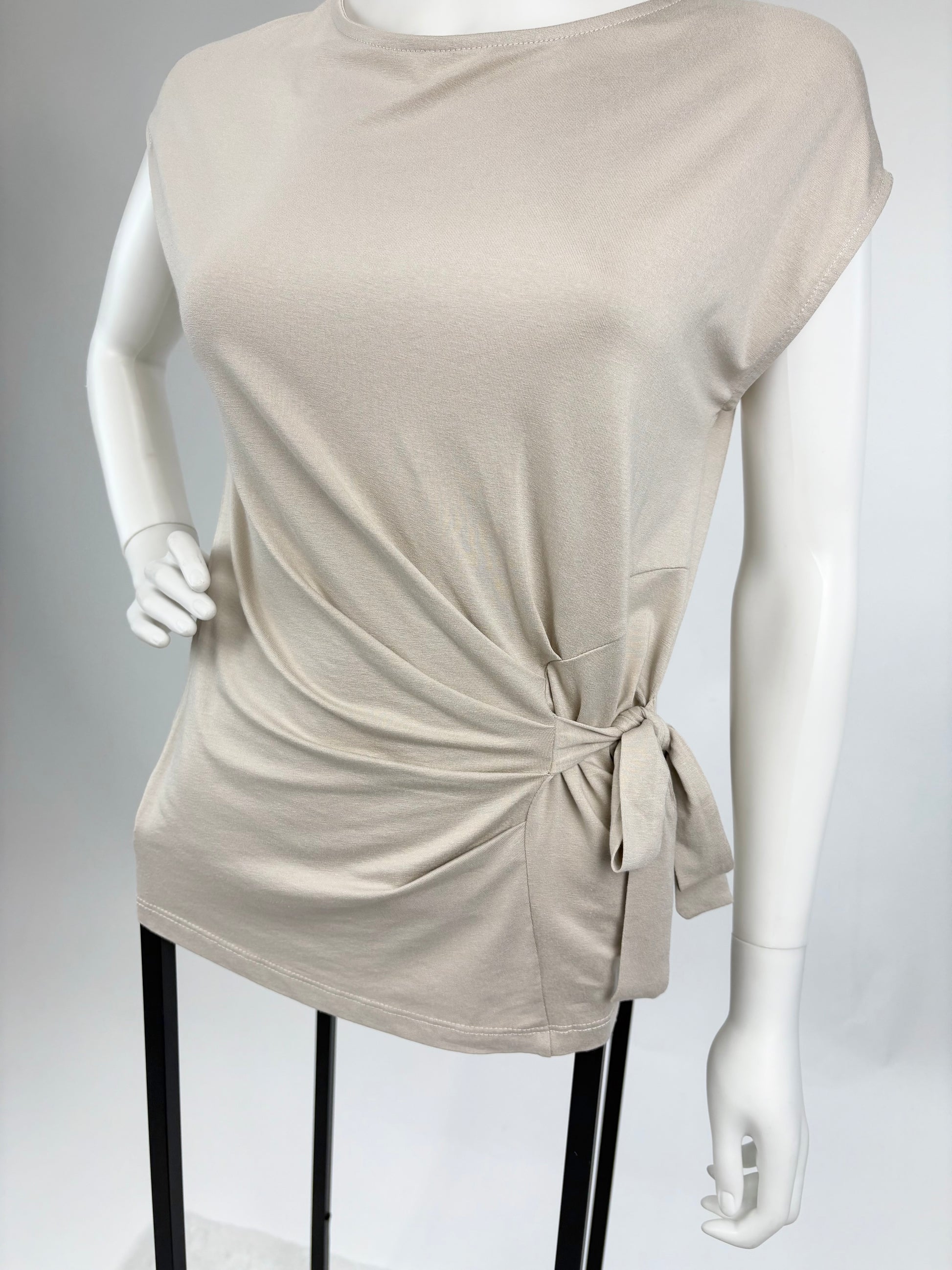 Ein minimalistisches Design mit besonderem Detail: Dieses T-Shirt in dezentem Beigeton wird durch den modischen seitlichen Knoten zum stilvollen Hingucker. Der weiche, fließende Stoff sorgt für ein angenehmes Tragegefühl und passt sich wunderbar der Figur an. Die leicht überschnittenen Schultern und der klassische Rundhalsausschnitt runden den Look ab. Perfekt für den Alltag, das Büro oder lässige Freizeitoutfits.