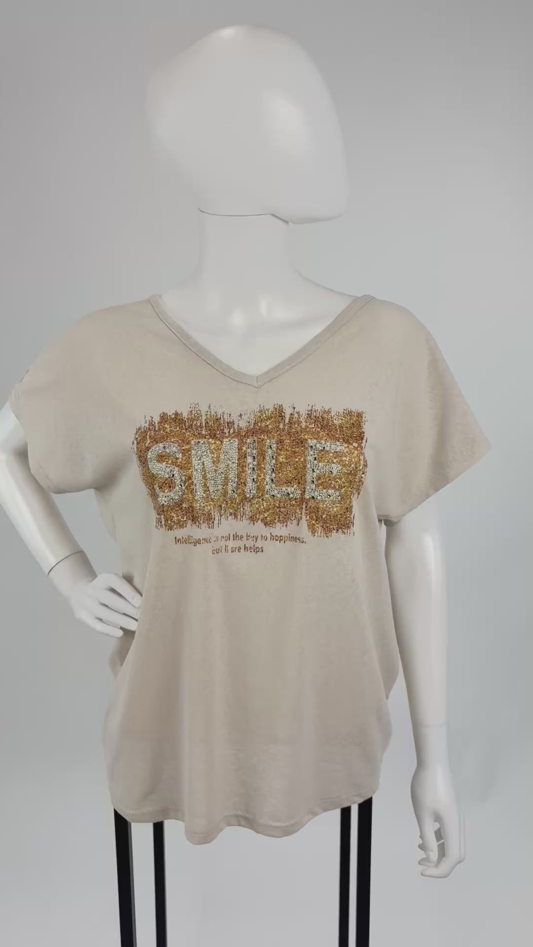 Ein echtes Statement-Piece für gute Laune! Dieses lässige T-Shirt in Beige überzeugt mit seinem auffälligen Glitzer-Print „SMILE“ in Gold und Silber. Der bequeme, lockere Schnitt und der schmeichelhafte V-Ausschnitt machen es zum idealen Begleiter für entspannte Looks mit einem Hauch Glamour. Unter dem Hauptprint befindet sich ein kleiner Schriftzug: