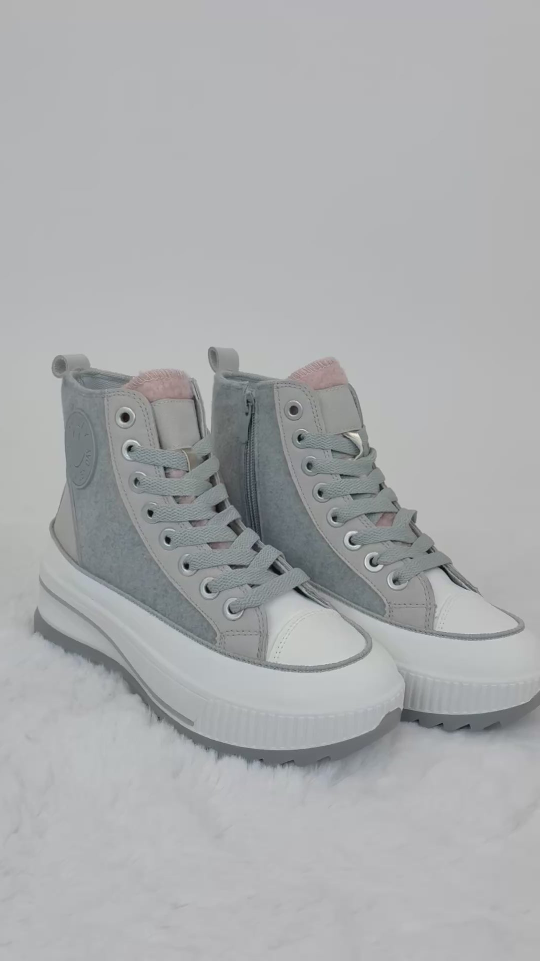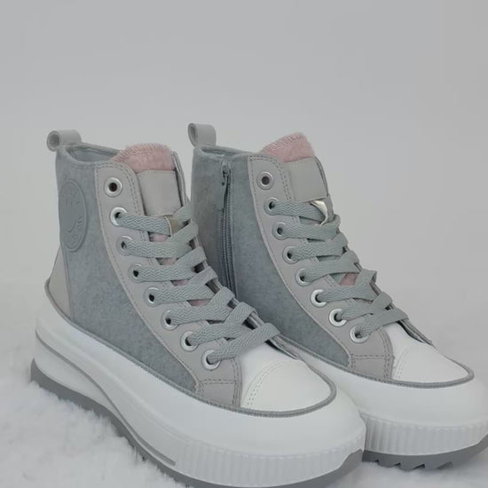 Bring Farbe in deinen Alltag mit diesen einzigartigen High-Top Sneaker! Die Kombination aus grau, Wollstoff und zartem rosa macht diesen Schuh zu einem echten Hingucker. Perfekt für modebewusste Trendsetter:innen, die Komfort und Style vereinen wollen.