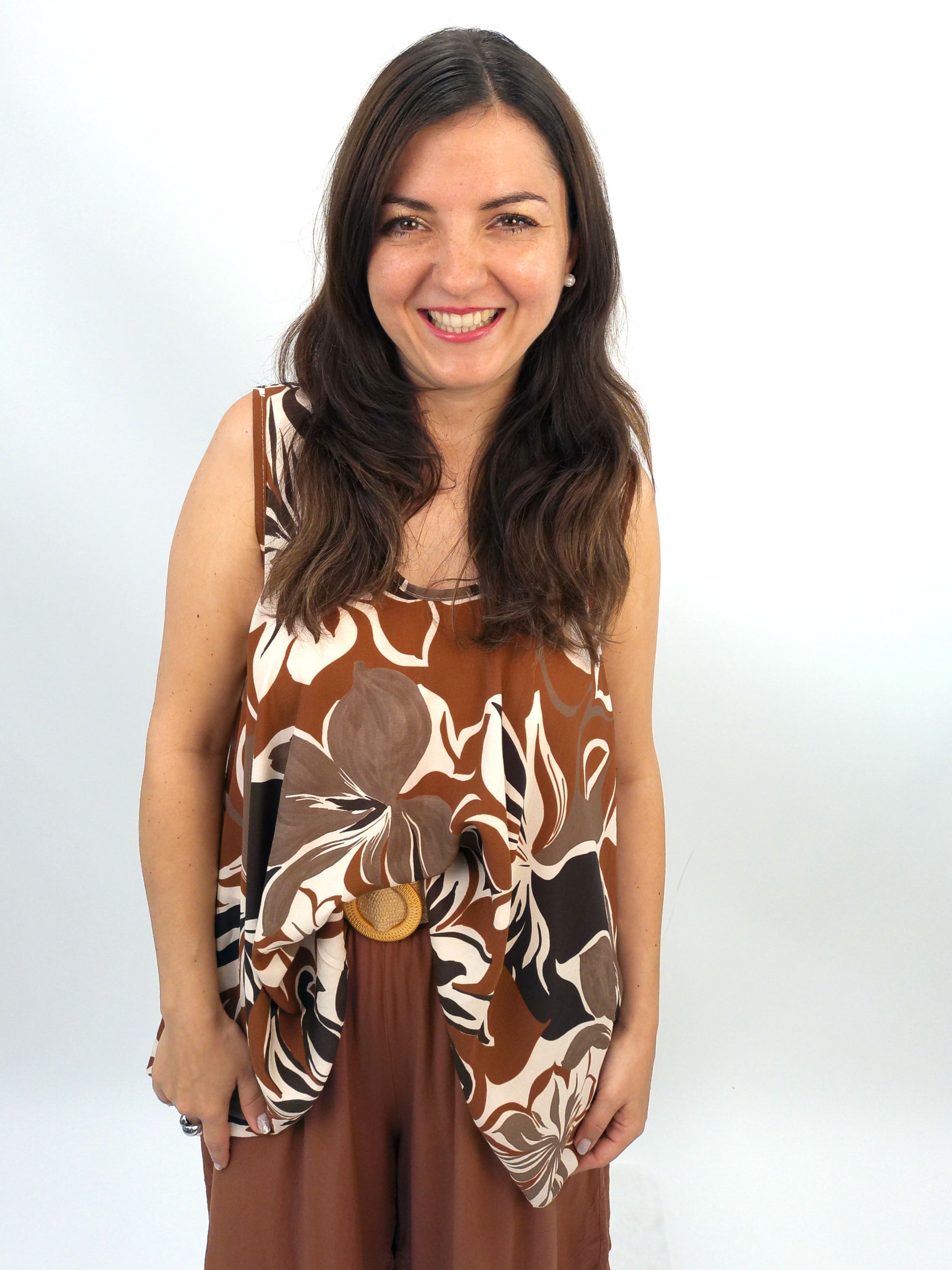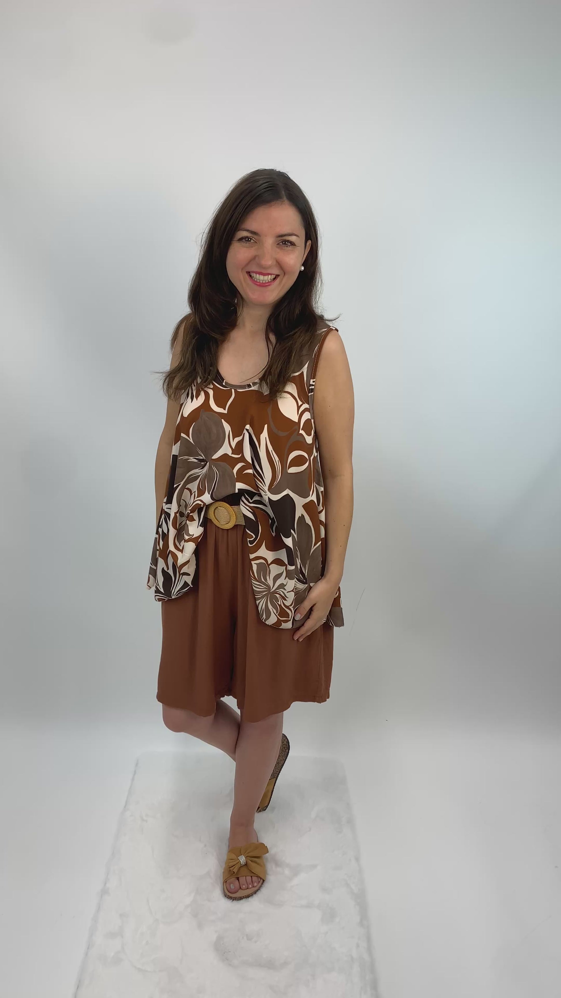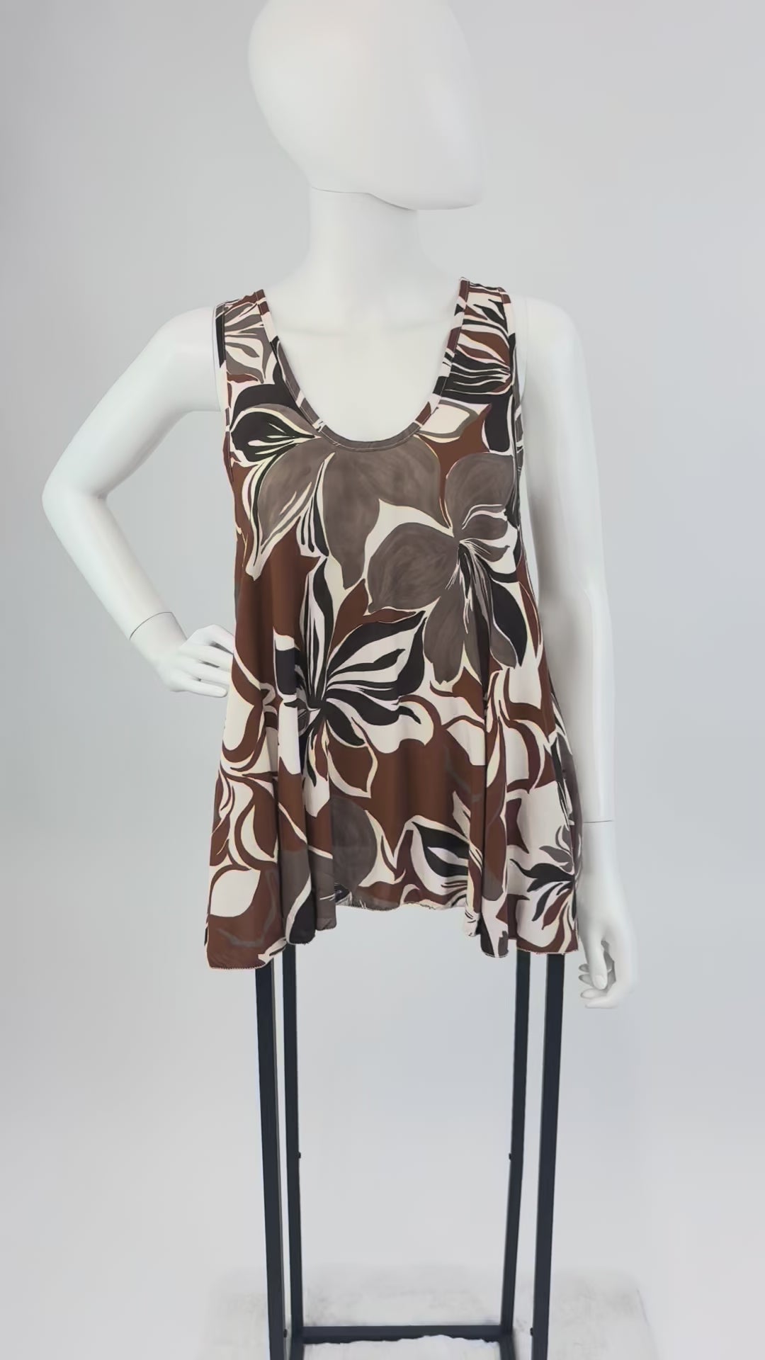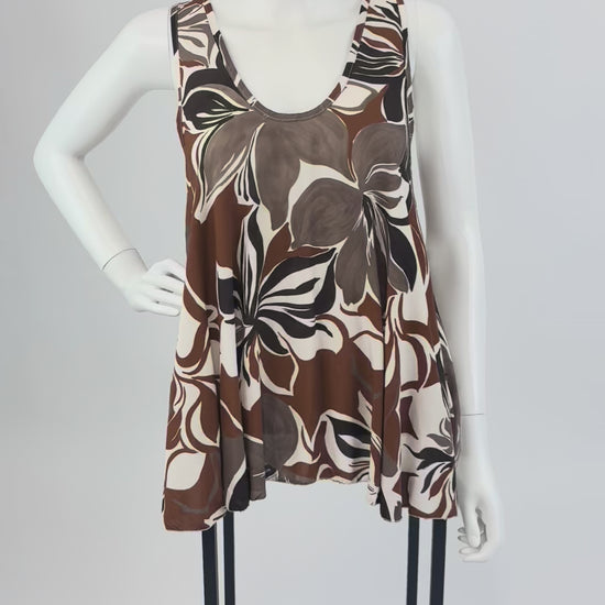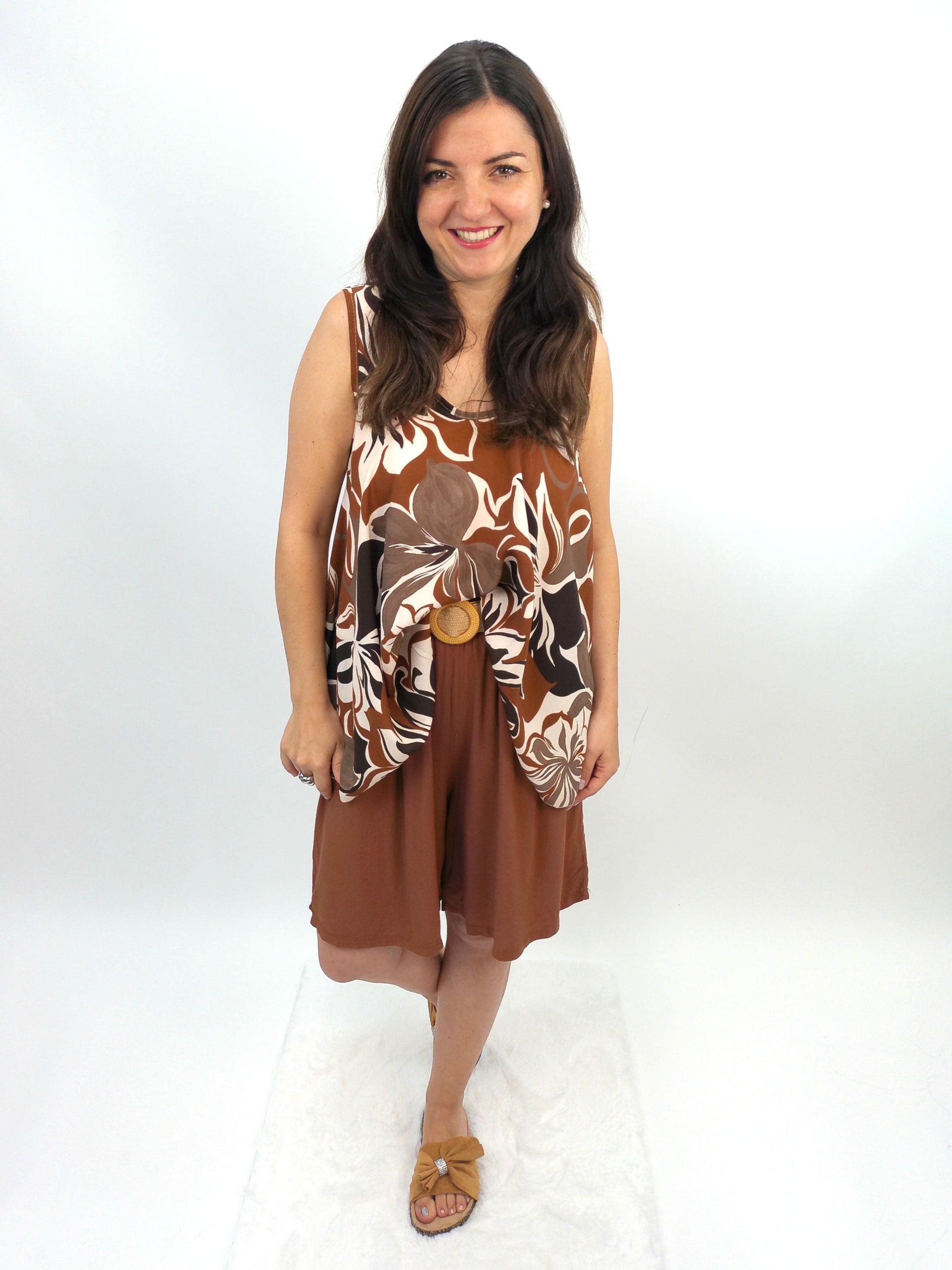 Dieses luftige Top begeistert mit seinem tropischen Blumenmuster in warmen Braun- und Cremetönen. Das florale Design macht es zu einem echten Hingucker und lässt sich perfekt mit unifarbenen Shorts, Röcken oder Jeans kombinieren. Das Top hat breite Träger und einen tiefen V-Ausschnitt vorne und hinten, der für einen femininen, sommerlichen Look sorgt. Durch seinen lockeren, leicht ausgestellten Schnitt fällt es schön fließend und bietet dir ein angenehmes, luftiges Tragegefühl.