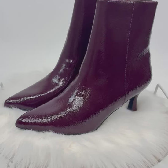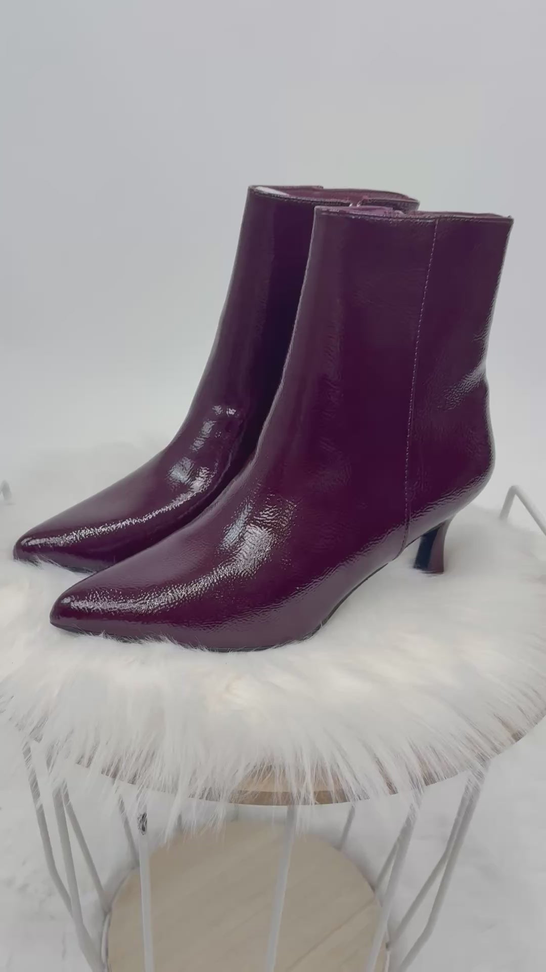 Setze ein modisches Statement mit diesen eleganten Damen Stiefeletten in glänzender Lack-Optik. Die Spitz zulaufende Vorderpartie und der schmale Schnitt verleihen dem Schuh eine besonders feminine und zugleich moderne Silhouette. In edlem Bordeaux-Ton gehalten, sind sie ein echter Hingucker – perfekt für stilvolle Herbst- und Winter-Looks.