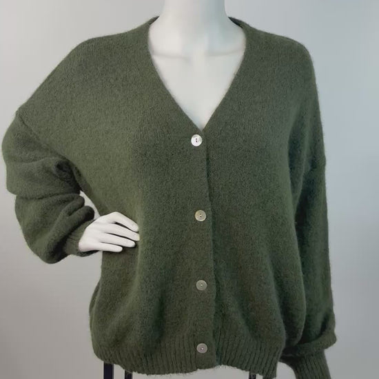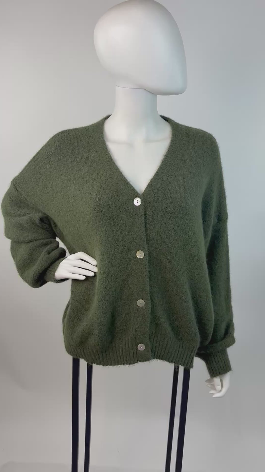 Dieser gemütliche Cardigan ist der perfekte Begleiter für die Übergangszeit und für kuschelige Alltagslooks. Das flauschige Strickmaterial sorgt für ein besonders weiches Tragegefühl, während der lockere, leicht oversized Schnitt eine lässige Silhouette schafft. Der V-Ausschnitt und die Knopfleiste mit dezenten Knöpfen verleihen dem Design einen klassischen femininen Touch. Die langen Ärmel und der gerippte Saum runden den Look stilvoll ab.
