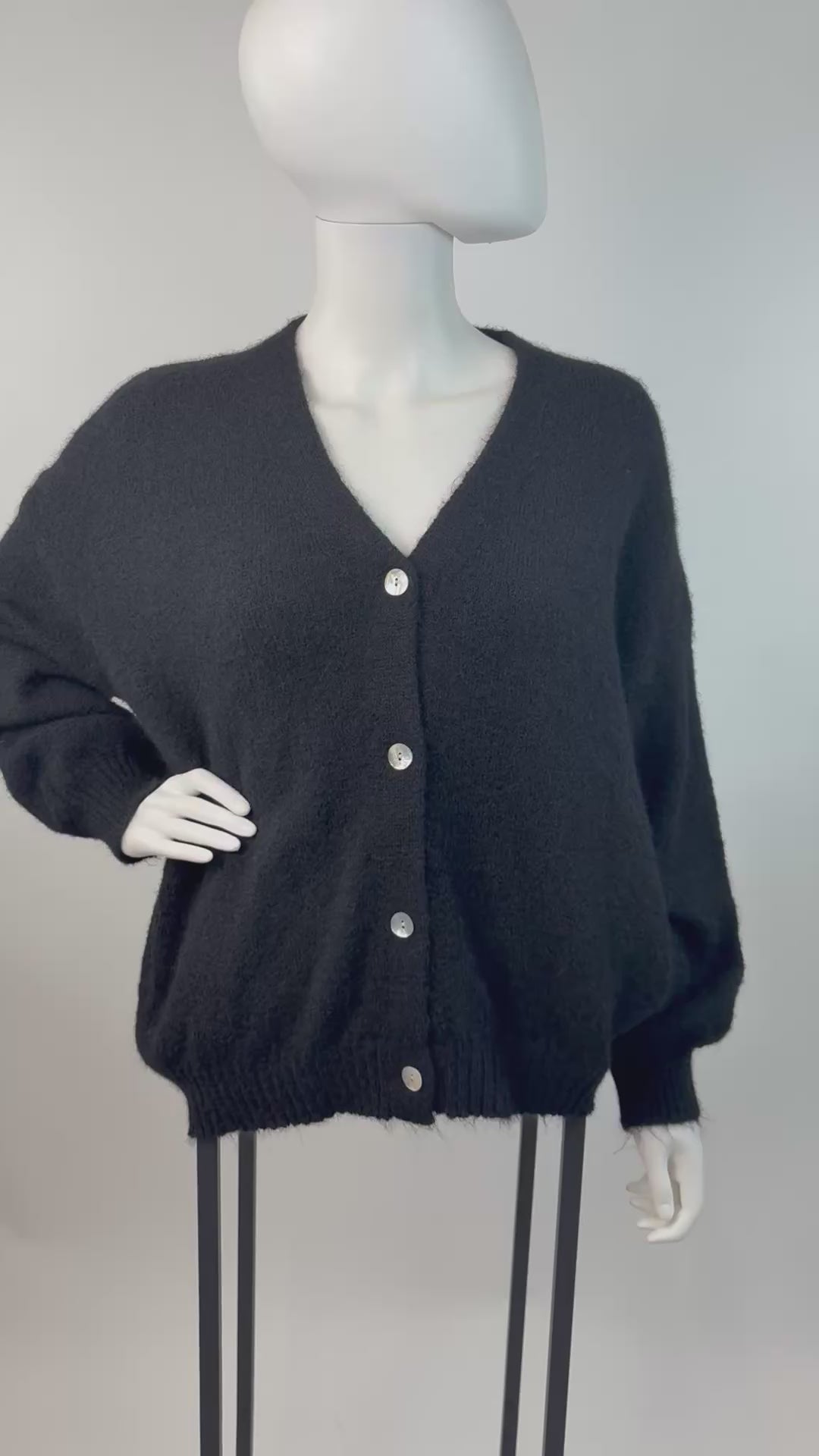 Dieser gemütliche Cardigan ist der perfekte Begleiter für die Übergangszeit und für kuschelige Alltagslooks. Das flauschige Strickmaterial sorgt für ein besonders weiches Tragegefühl, während der lockere, leicht oversized Schnitt eine lässige Silhouette schafft. Der V-Ausschnitt und die Knopfleiste mit dezenten Knöpfen verleihen dem Design einen klassischen femininen Touch. Die langen Ärmel und der gerippte Saum runden den Look stilvoll ab.