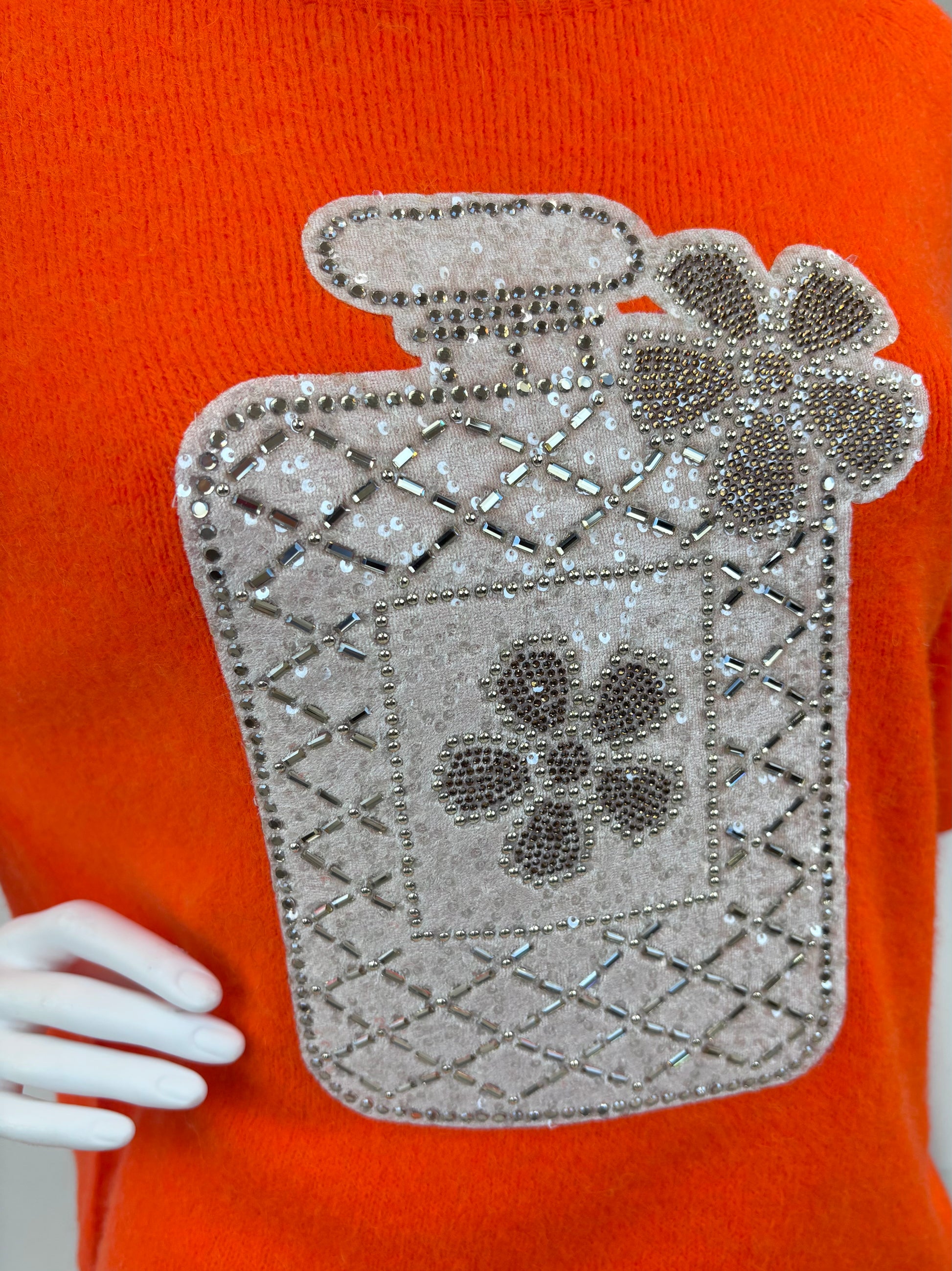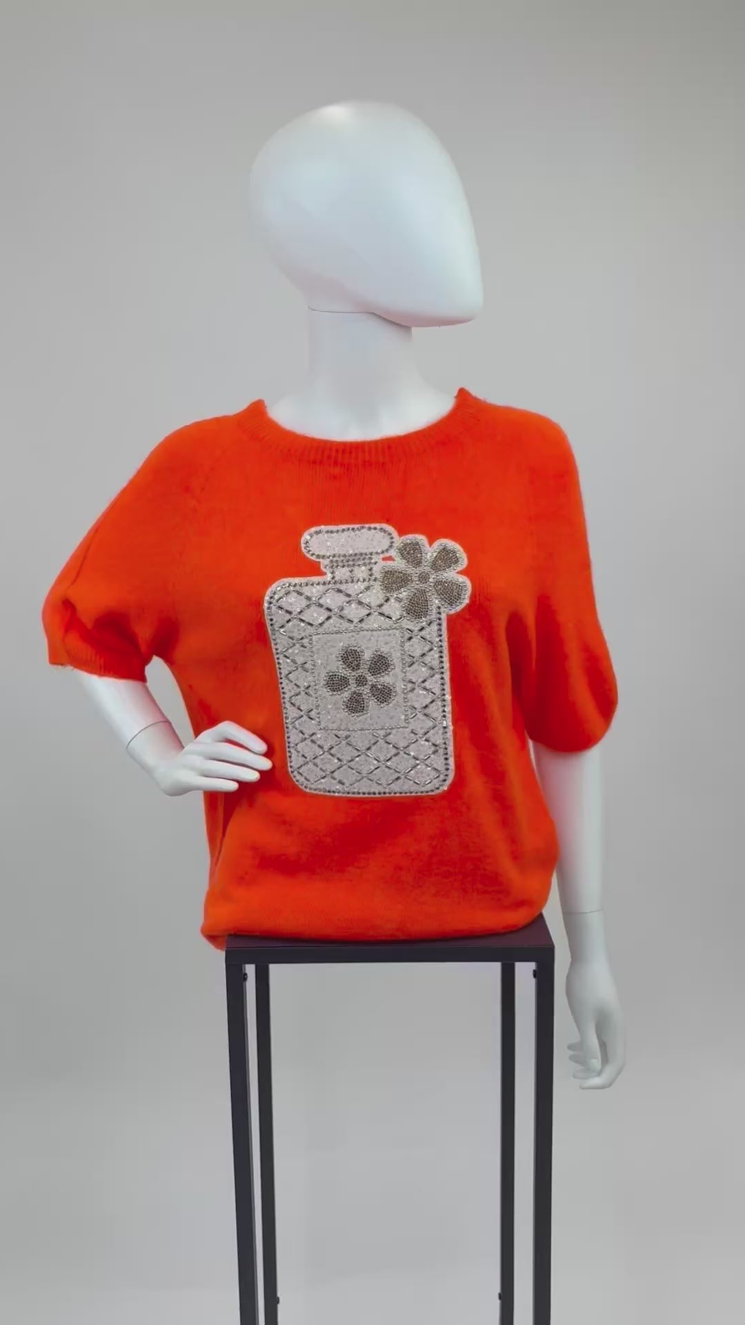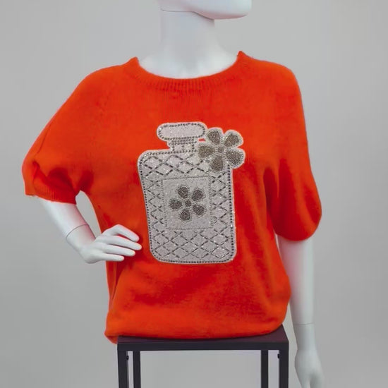 Dieses trendige Strickshirt bringt Farbe und Glamour in deinen Look! Der kräftige Orangeton sorgt für gute Laune, während das große Flakon-Motiv aus funkelnden Pailletten und Strasssteinen einen edlen Akzent setzt. Dank des lockeren Schnitts und der kurzen Ärmel ist es vielseitig tragbar - perfekt für ein modisches Statement im Alltag.