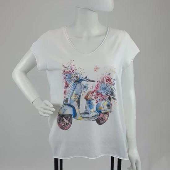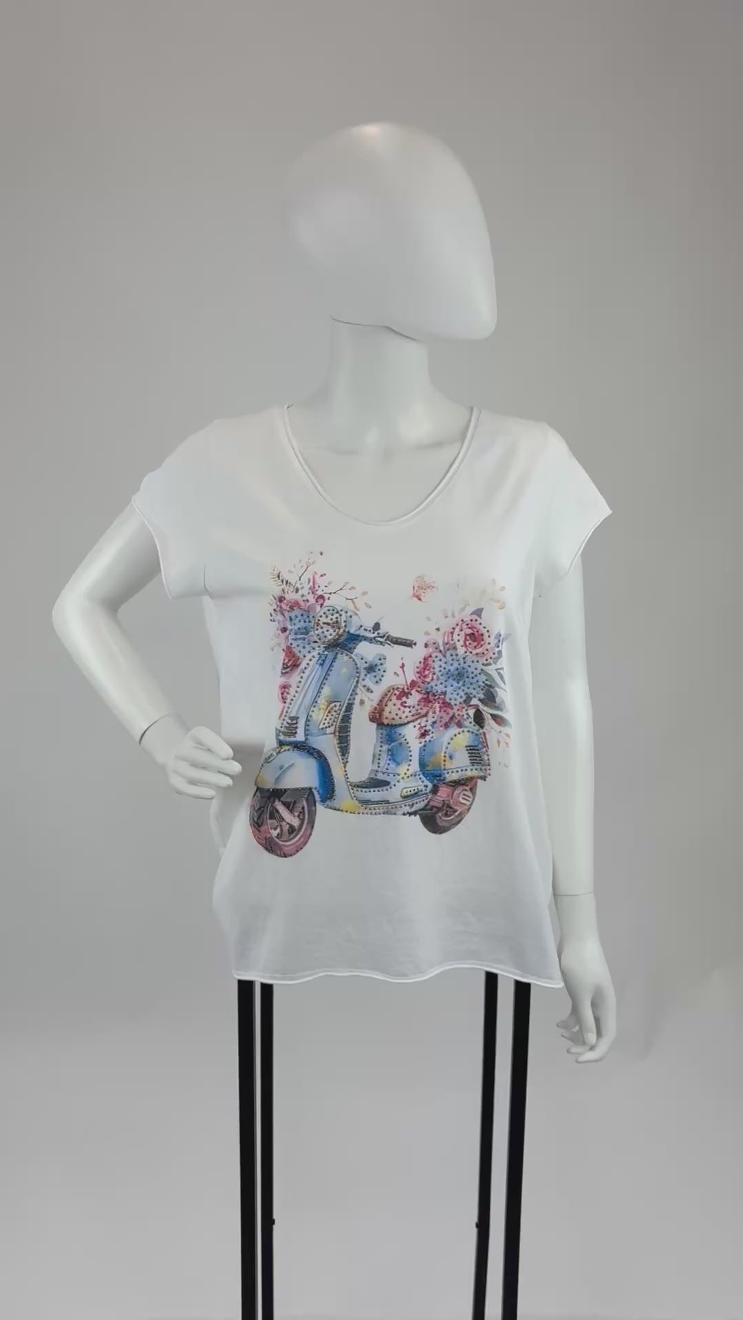 Dieses stylische Damen T-Shirt bringt Leichtigkeit in deinen Kleiderschrank! Der verspielte Print zeigt einen nostalgischen, hellblauen Motorroller, der von bunten Blumenarrangements umgeben ist – ein echter Blickfang und perfekt für alle, die den romantischen Vintage-Stil lieben. Der lockere Schnitt mit kurzen Ärmeln und einem dezenten Rundhalsausschnitt macht es zum idealen Begleiter.