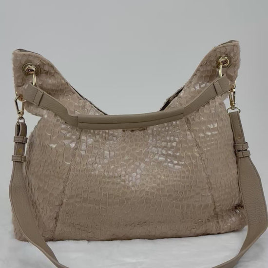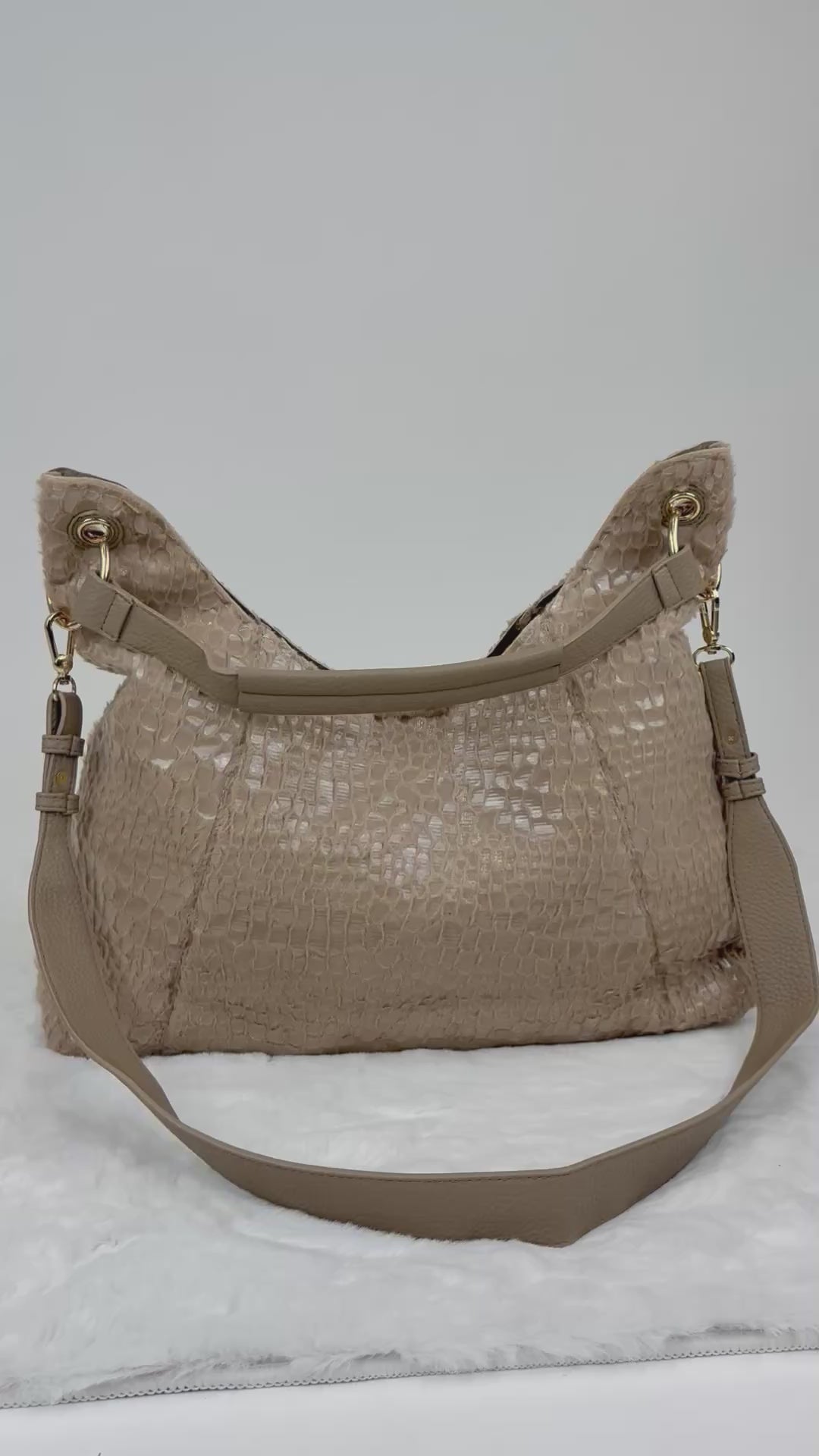 Die Hobo-Bag „Croc caramel“ vereint stilvolle Eleganz mit praktischer Funktionalität. . Die goldfarbenen Metallakzente und der abnehmbare, breite Schulterriemen sorgen für maximalen Tragekomfort und Vielseitigkeit.