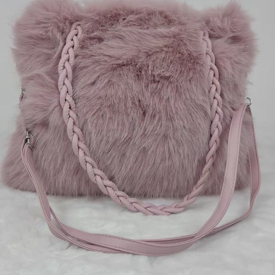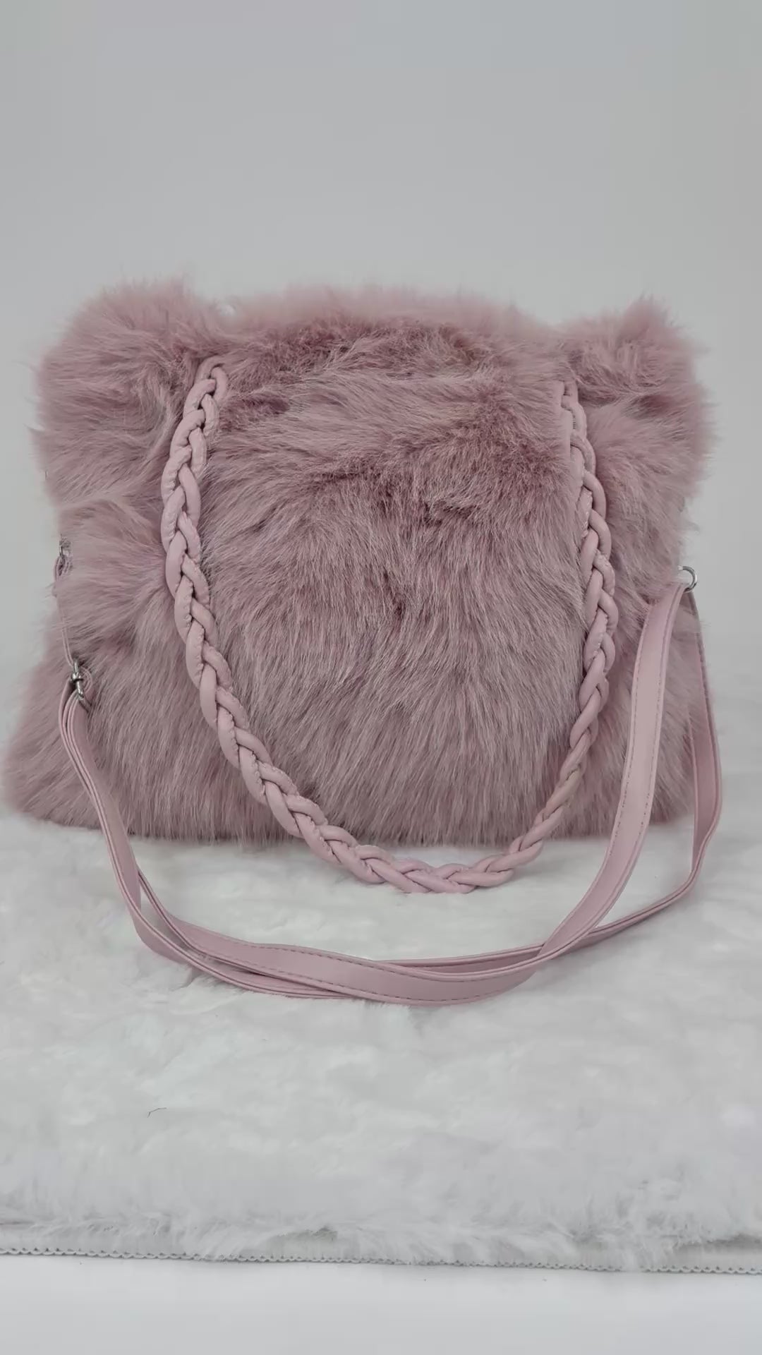 Das flauschige Kunstfell in edlem Altrosa verleiht der Tasche einen luxuriösen Look, während die geflochtenen Tragegriffe und der verstellbare Schulterriemen aus Kunstleder für einen stilvollen Akzent sorgen. Innen bietet sie genügend Platz für Handy, Geldbörse und kleine Essentials – ideal für Alltag, City-Trips oder kuschelige Winter-Outfits.
