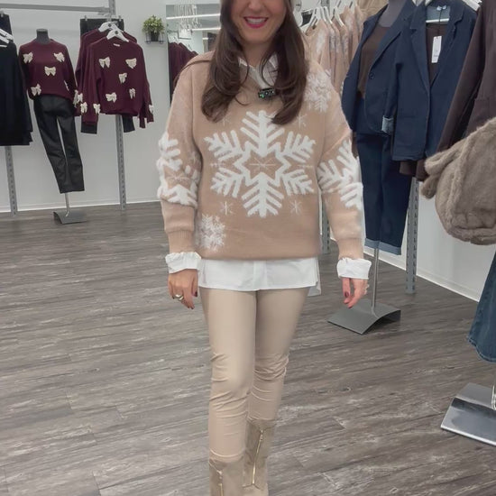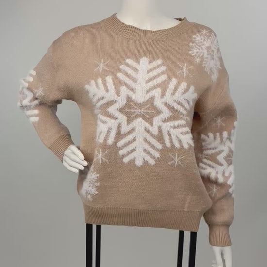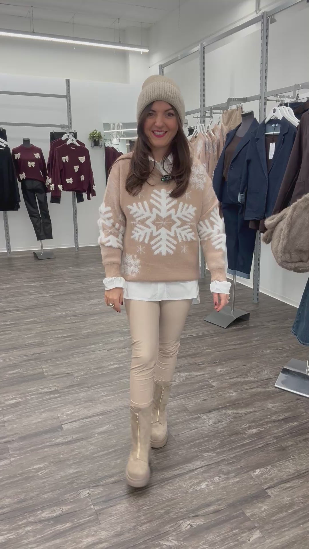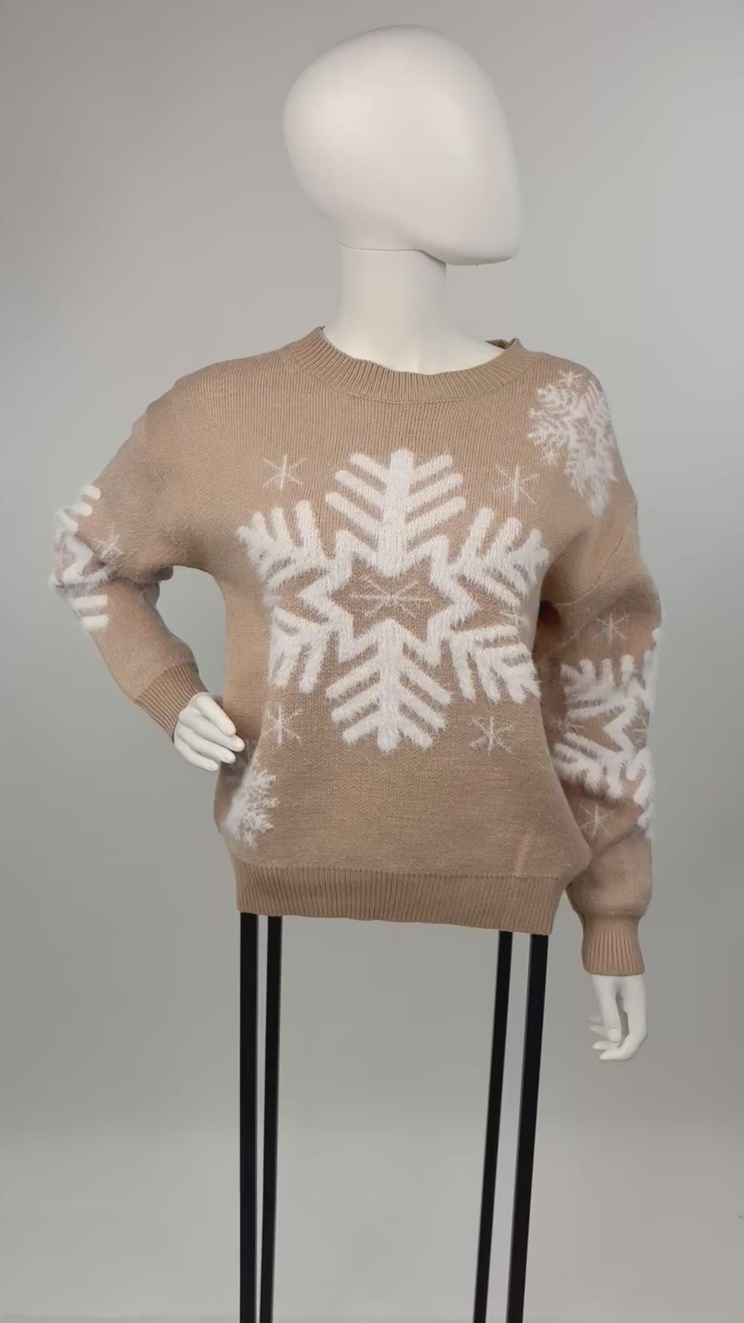 Der Winterpullover bringt dich warm und stilvoll durch die kalte Jahreszeit! Das große weiße Schneeflocken-Muster auf sanftem Camel-Beige verleiht dem Pullover einen gemütlich-festlichen Look – perfekt für die Winter- und Weihnachtszeit. Das weiche Strickmaterial fühlt sich angenehm auf der Haut an und sorgt für hohen Tragekomfort. Mit seinem lockeren, leicht oversized Schnitt lässt sich der Pullover wunderbar zu Jeans, Stoffhosen oder Leggings kombinieren.